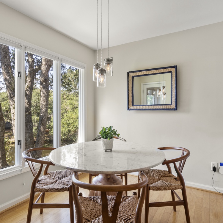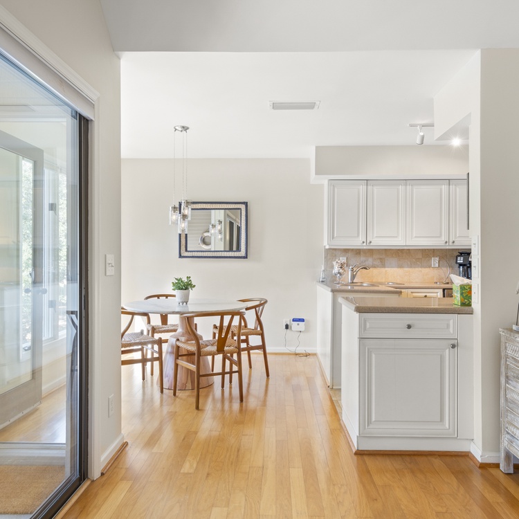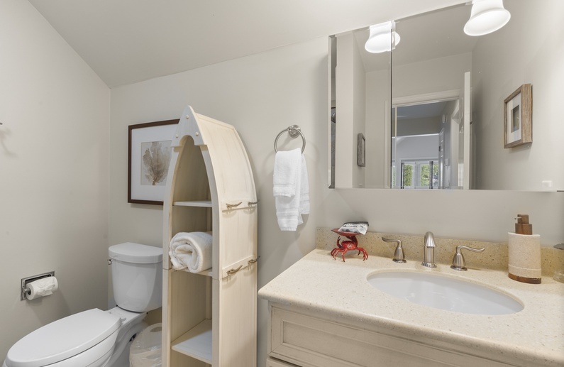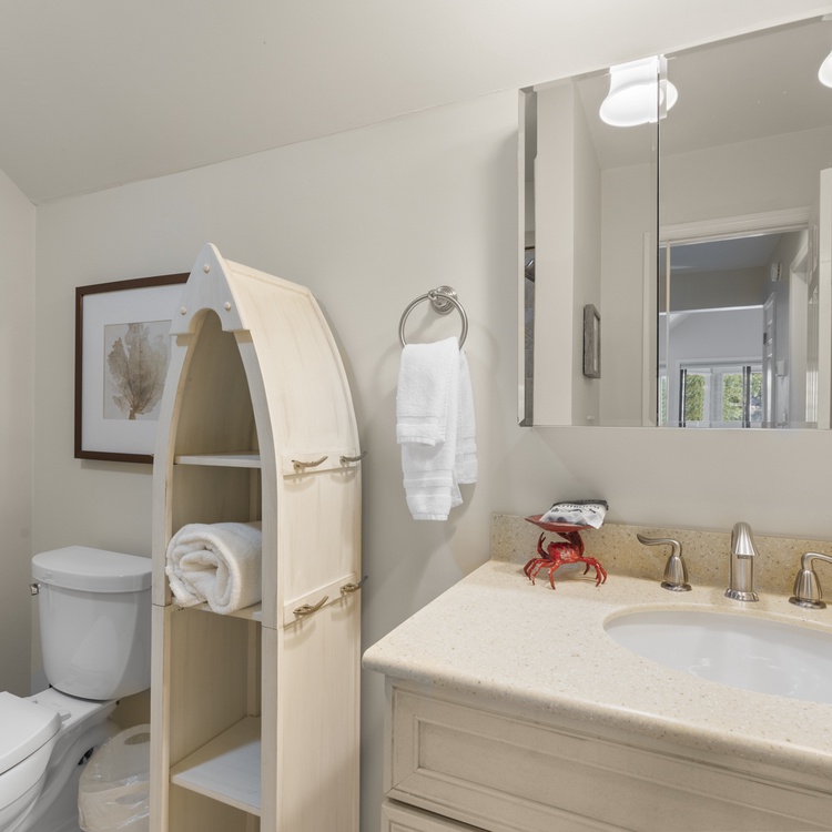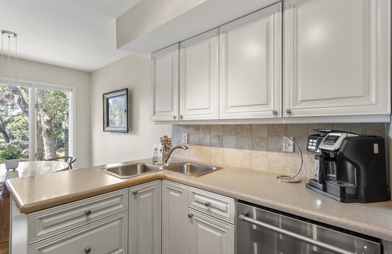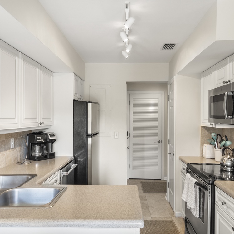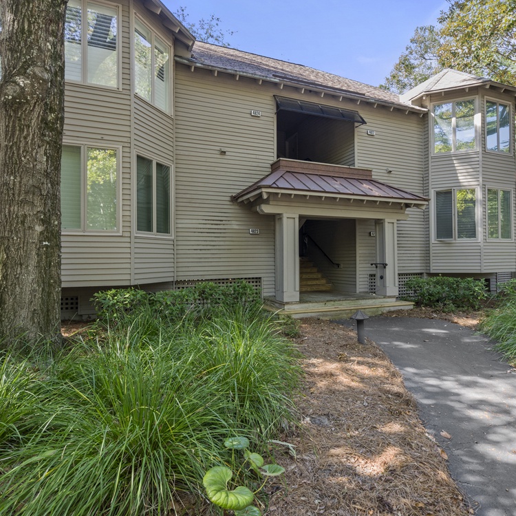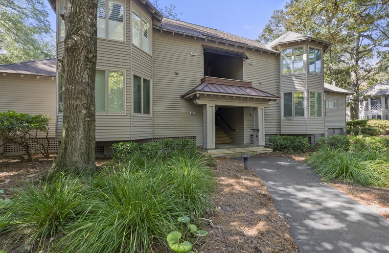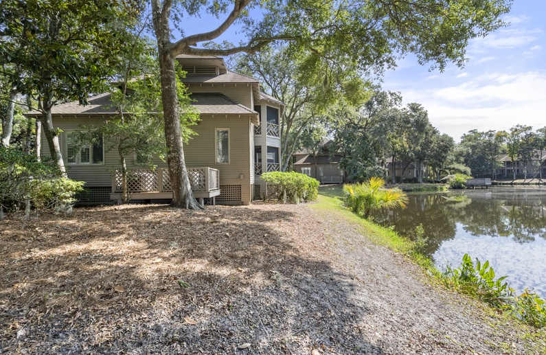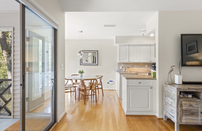 Conveniently situated in Kiawah's East Beach area, this second-floor Turtle Cove villa offers a central location in a serene setting. The main living area welcomes you with sweeping lagoon views and offers comfortable seating, a wall-mounted TV, and access to the screened porch. Continue to the fully-equipped kitchen, where you will find white cabinets, stainless steel appliances, and plenty of space for meal preparation. The adjacent dining area has a wonderful view of the water and is the perfect place to eat, snack, or play a game of cards.