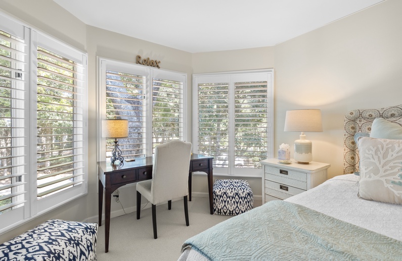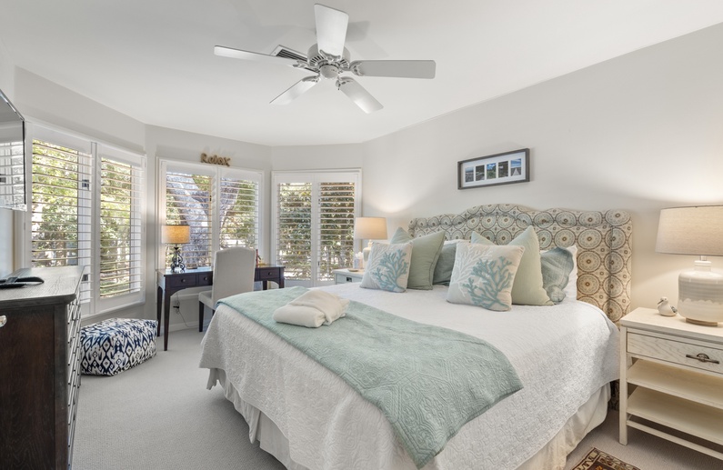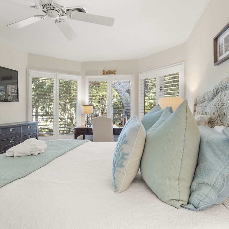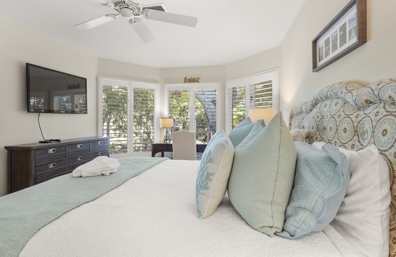 Relax after a day of golf, tennis, or beachcombing in the villa's bedroom. Here, you will find a king-sized bed, a mounted TV, a writing desk, and ample natural light. The attached bathroom has a walk-in shower.