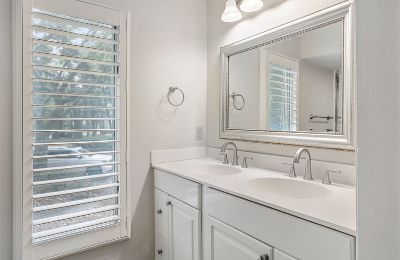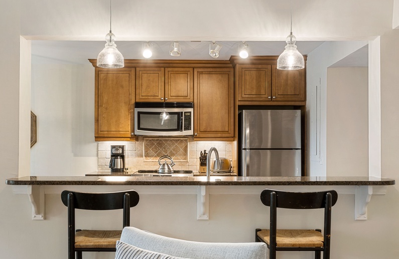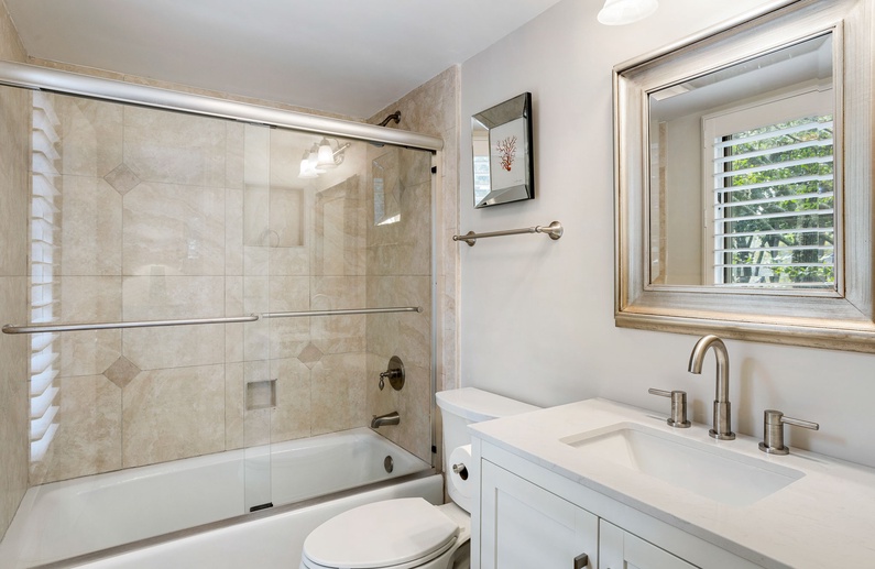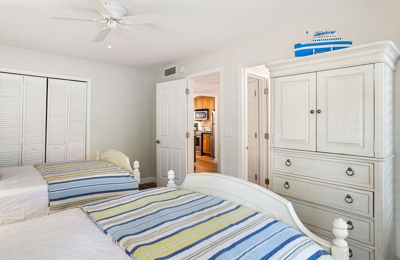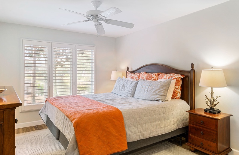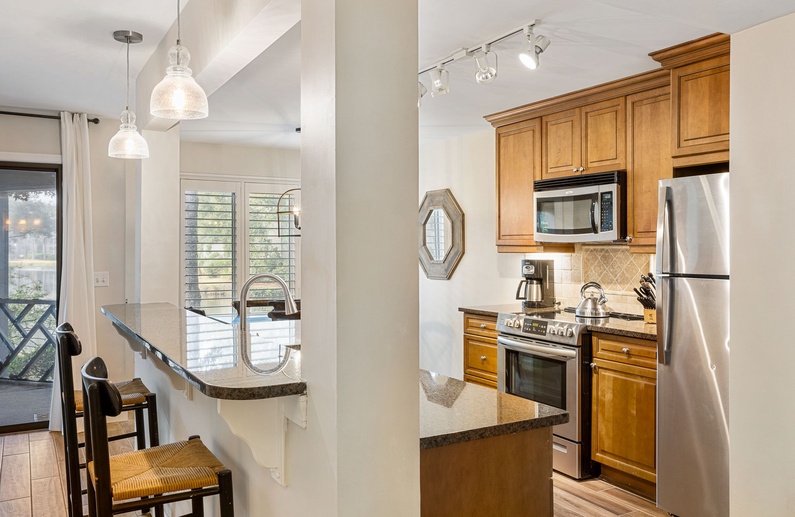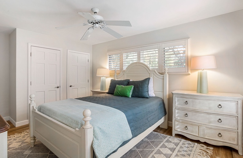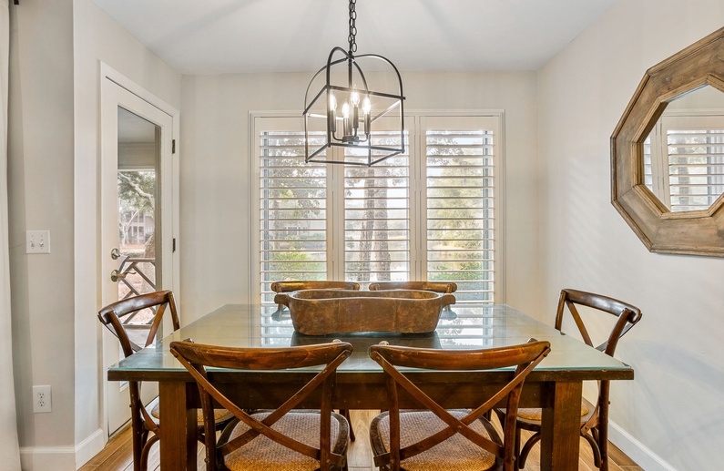 This adorable, coastal-themed villa offers a living space with comfortable seating, a flat-screen TV, and access to the screened porch. The updated kitchen has stainless steel appliances, wood cabinets, bar stool seating for 2, and is well equipped to meet your cooking needs. With seating for 6, the dining area located right off the kitchen is the perfect area for hosting meals. It also offers access to the breezy screened porch.