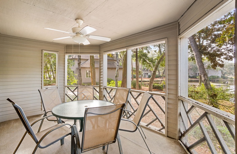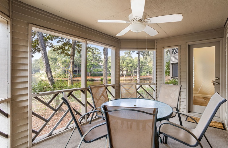 The villa’s screened porch has views of the lagoon and boasts a ceiling fan, table and chairs that comfortably seats 6.