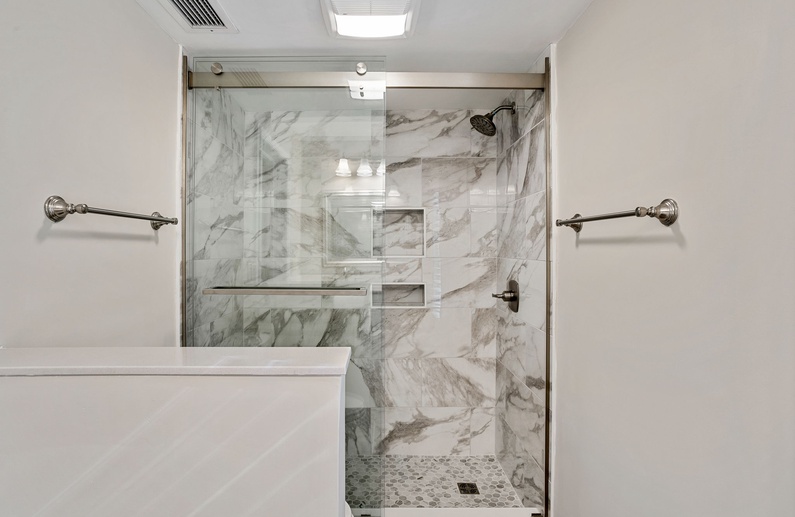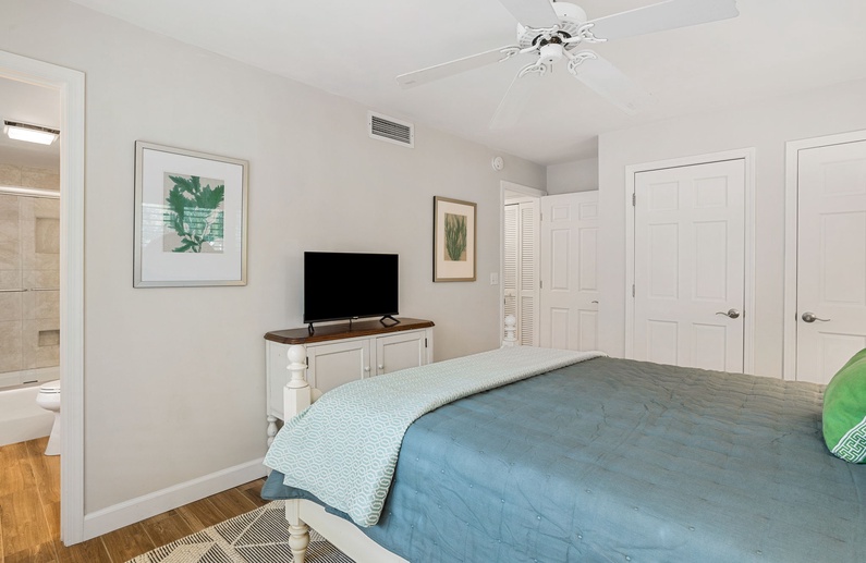 Past the living room is the primary bedroom with a king bed, flat-screen TV, and private bathroom. On the same side of the villa, there is a bedroom with a queen bedroom, flat-screen TV, and a private bathroom. On the other side of the living room, there is a bedroom with 2 full beds and private access to the hallway bathroom.
