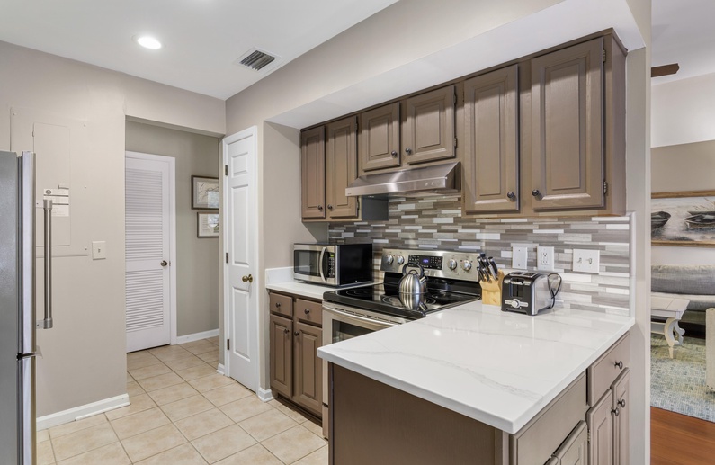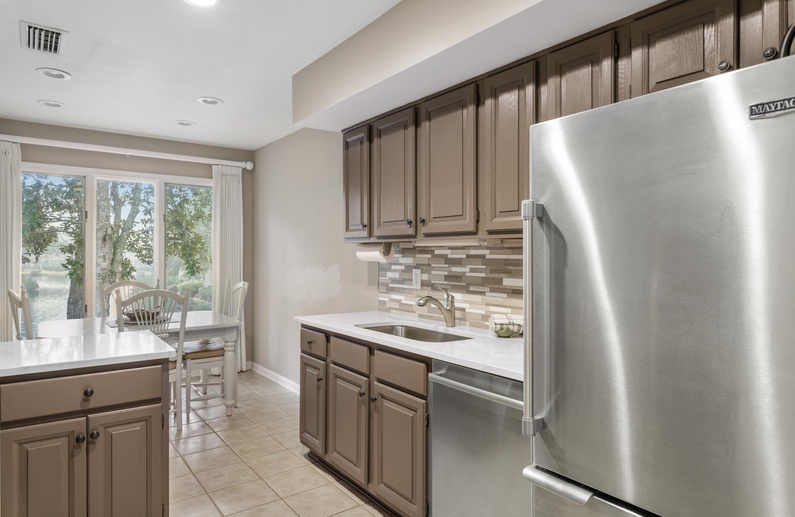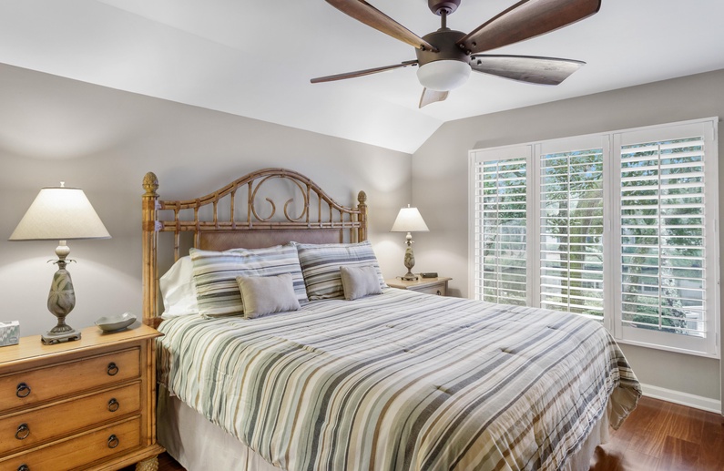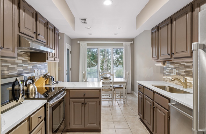 The villa welcomes you with lovely lagoon views that can be seen from the kitchen, eating area, family room, and primary bedroom. You will immediately feel relaxed in the soothing designer colors and furniture throughout the villa. The screened porch is a great place to enjoy the fabulous lagoon views and sunsets. The living room is a great gathering space to watch a movie, play a game, listen to music or read a book. The kitchen opens up to the dining room with a table and seating for 4 and has convenient access to the screened porch. Enjoy your cup of coffee (brewed by either the Keurig or standard coffee maker in the villa) while taking in the gorgeous lagoon view!