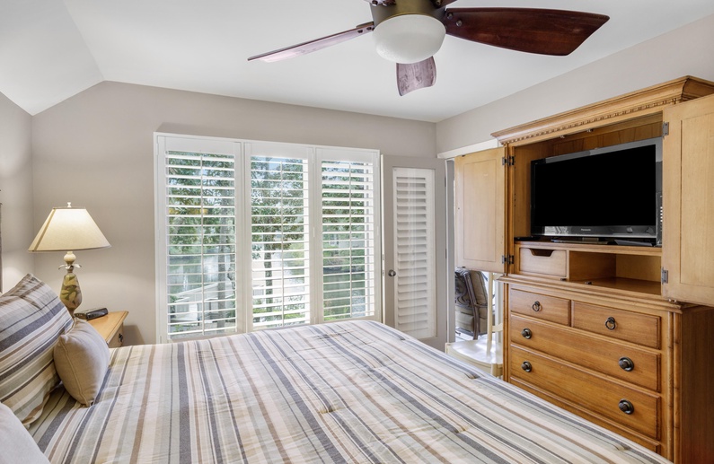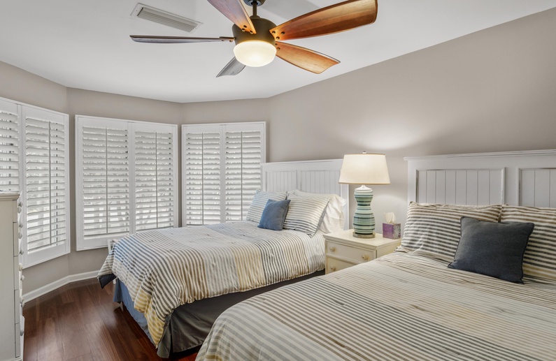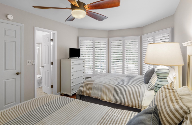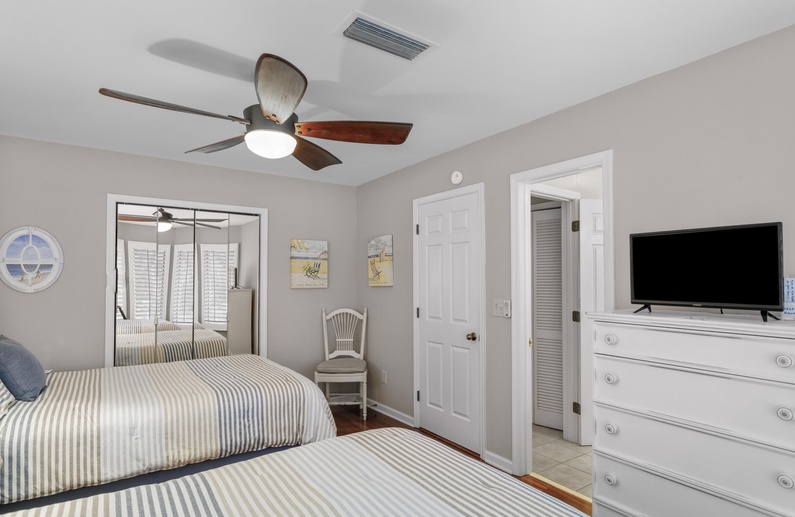 The primary bedroom features a king bed, ceiling fan, an armoire with a TV, and private bathroom. The second bedroom has two full beds, SmartTV, and an attached full bath.