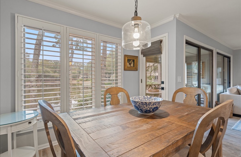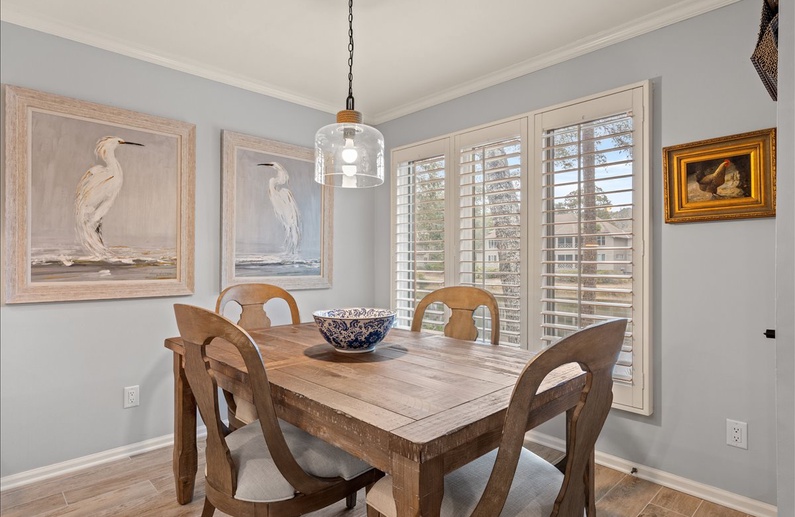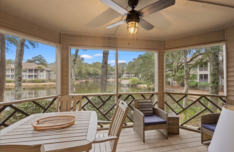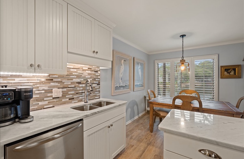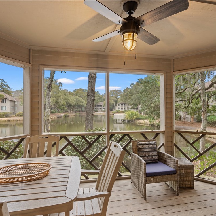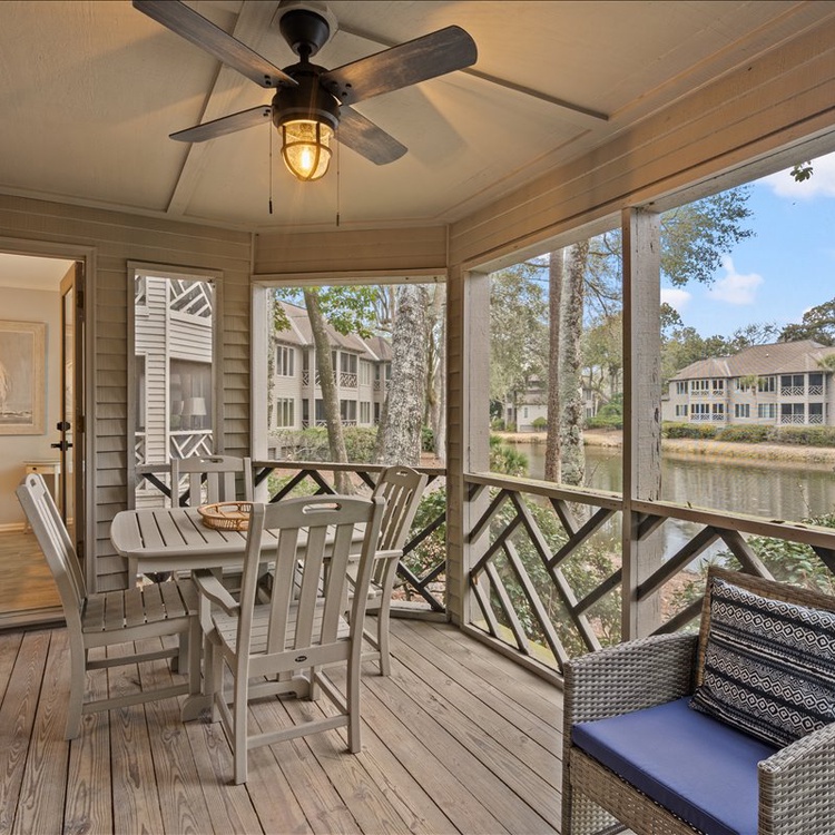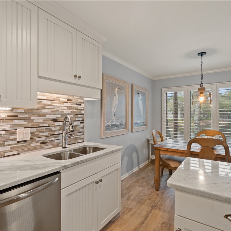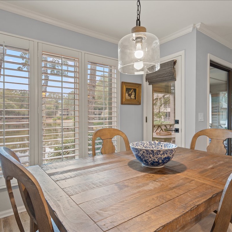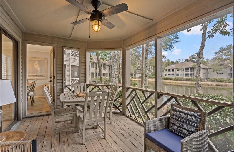 The fully-equipped modern kitchen showcases a striking multi-color tile backsplash, sleek stainless steel appliances, and elegant quartz countertops. Whether you're preparing a quick breakfast before heading to the beach or a full family dinner, you'll have everything you need. Just off the kitchen, the dining area seats four and features a window overlooking the tranquil lagoon, offering a peaceful backdrop for meals. From the dining area, step out onto the screened porch and take in the beautiful lagoon views. This inviting outdoor space includes a dining set for four as well as a cozy lounge area with a loveseat and additional chairs, perfect for morning coffee, evening cocktails, or simply admiring the nature that Kiawah Island has to offer.
