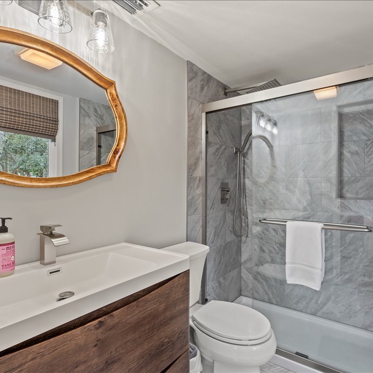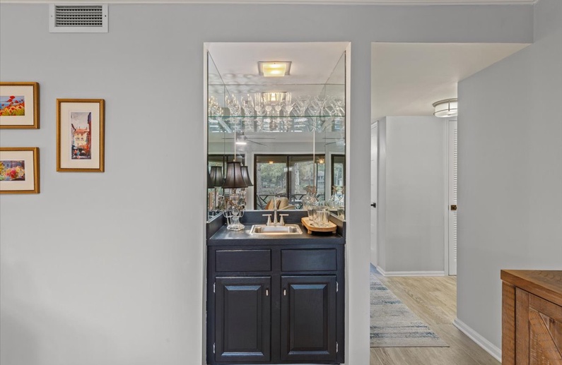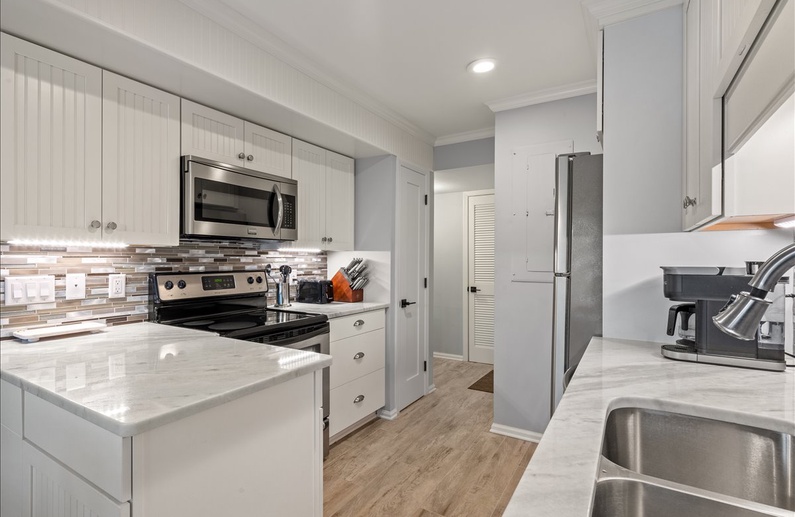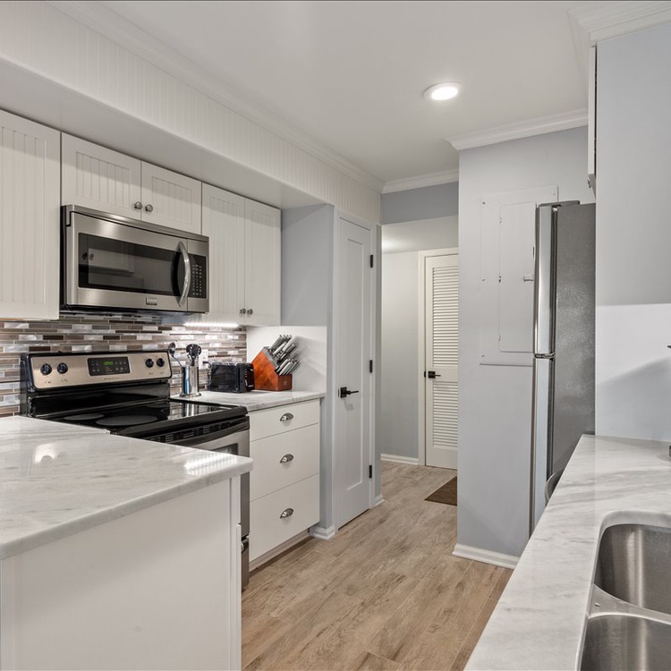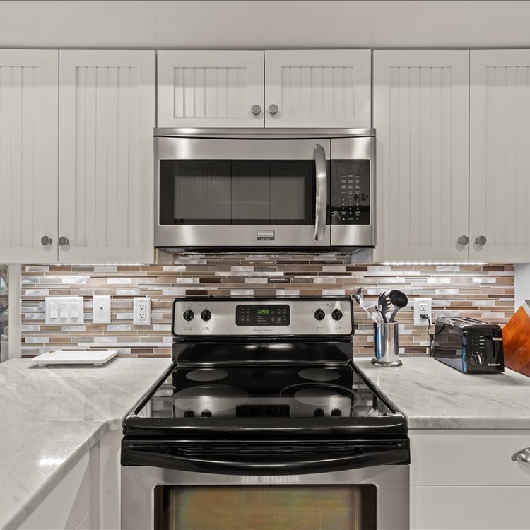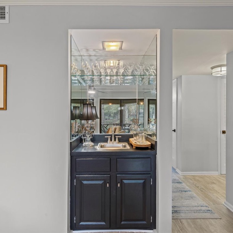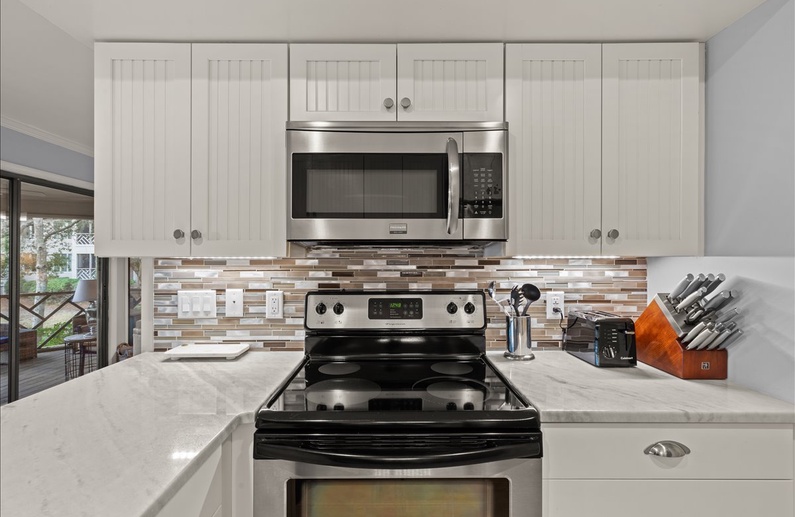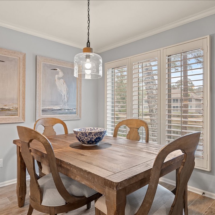 The fully-equipped modern kitchen showcases a striking multi-color tile backsplash, sleek stainless steel appliances, and elegant quartz countertops. Whether you're preparing a quick breakfast before heading to the beach or a full family dinner, you'll have everything you need. Just off the kitchen, the dining area seats four and features a window overlooking the tranquil lagoon, offering a peaceful backdrop for meals. From the dining area, step out onto the screened porch and take in the beautiful lagoon views. This inviting outdoor space includes a dining set for four as well as a cozy lounge area with a loveseat and additional chairs, perfect for morning coffee, evening cocktails, or simply admiring the nature that Kiawah Island has to offer.