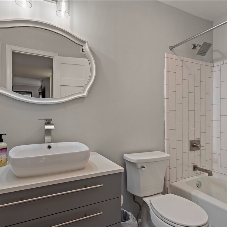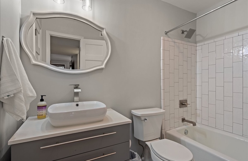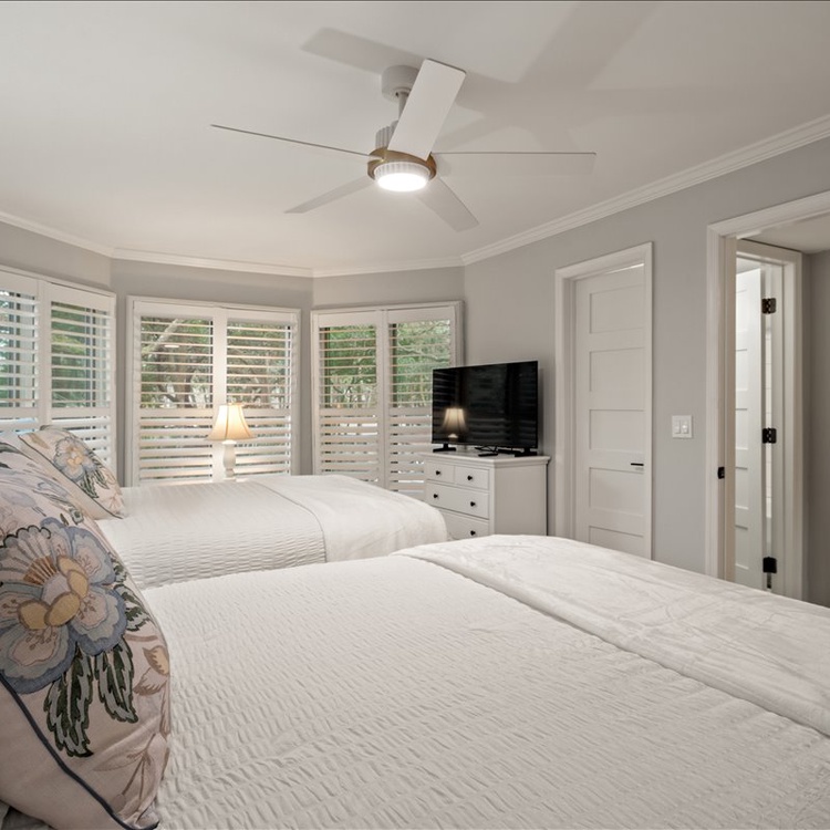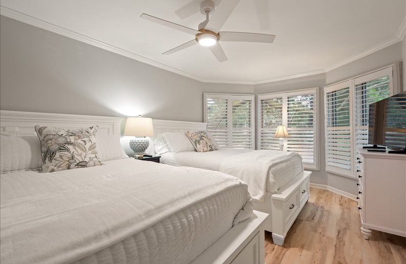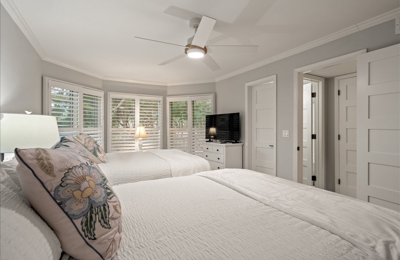 Bedroom two offers two full-size beds, a TV, and a modern en suite bathroom complete with a dark wood vanity and a walk-in shower. Bedroom three is ideal for family or guests, featuring two queen beds, a TV, and a bathroom with convenient access from both the bedroom and the hallway, also equipped with a shower/tub combo.