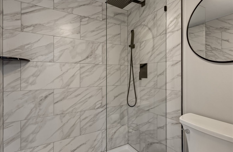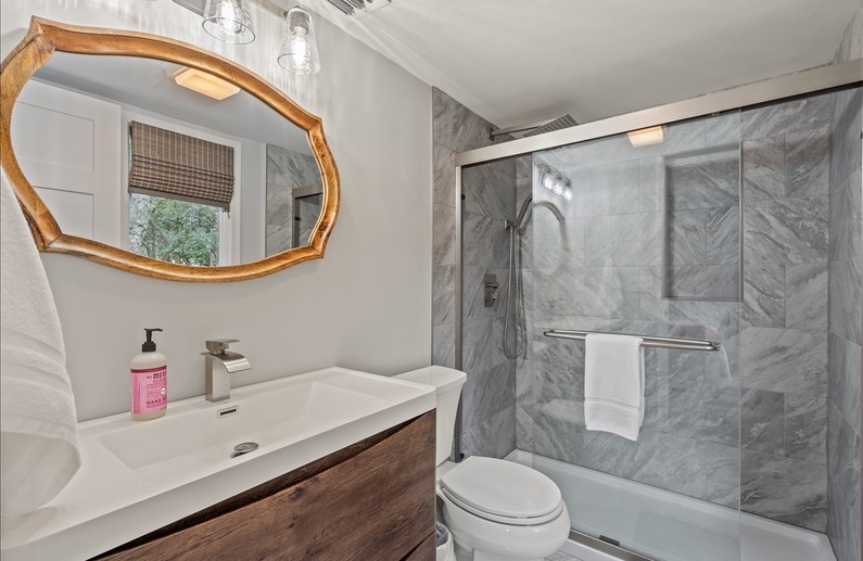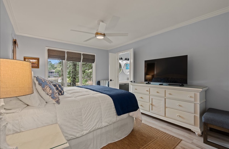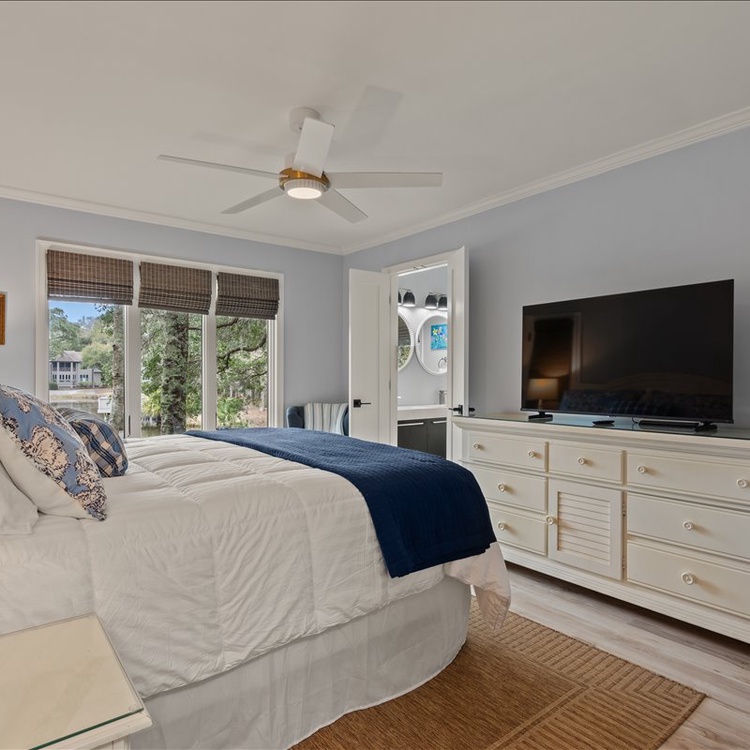 The primary bedroom offers a king-size bed, lagoon views, and a TV for added comfort. The en suite bathroom is thoughtfully updated with dual vanities and a beautifully redesigned shower featuring black accents and marble-look tile for a spa-like feel.