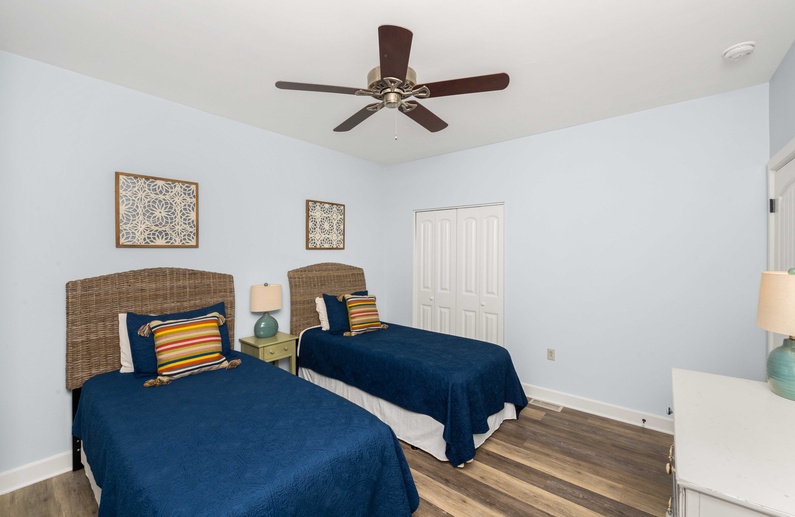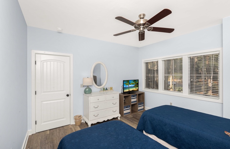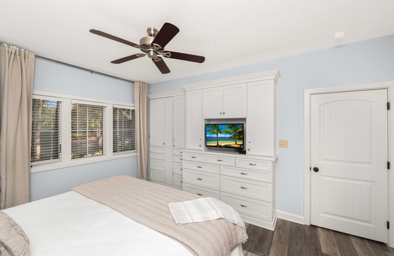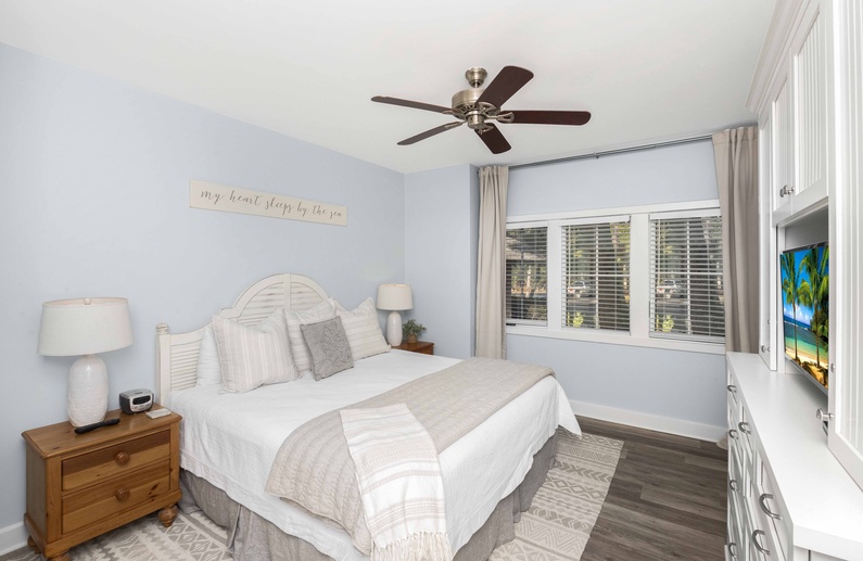 The primary bedroom showcases a king-sized bed, flat screen TV, lovely built-ins, and private bathroom with a shower/tub combination. The second bedroom features two memory foam twin beds, flat-screen TV, and is close to the hallway bathroom that offers a walk-in shower.