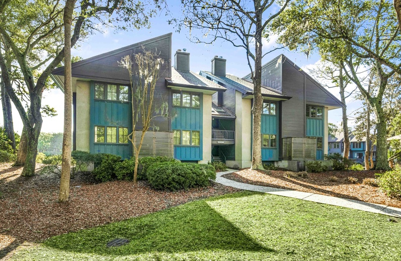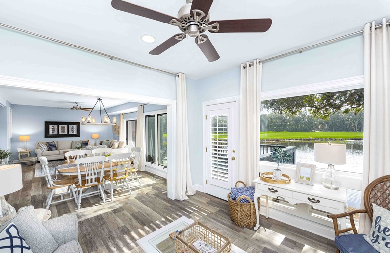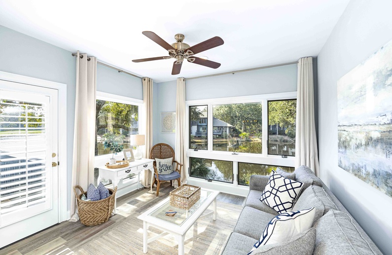 This first-floor renovated Kiawah Island vacation rental is a Turtle Point Villa that features two bedrooms, a sunroom, and great golf and lagoon views. The villa is a six-minute walk or two-minute bike ride from Kiawah's spectacular beach.