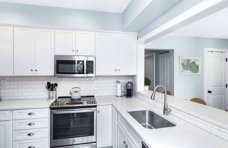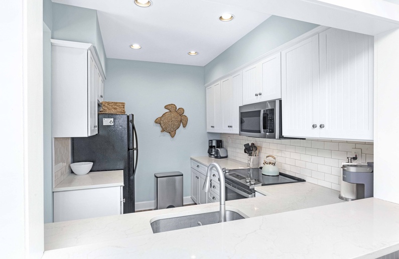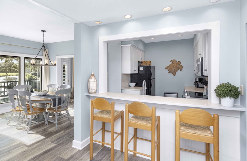The living area features a comfortable couch, love seat, swivel chair, 65” Smart TV which allows guests to access Netflix, Hulu, and other apps with personal subscriptions. HDMI also provides guests with the ability to connect personal gaming consoles and laptops. Enjoy your favorite movie or sporting event with surround sound provided by the Bose Soundbar. Step out through the sliding glass doors onto the open back deck where you will find plenty of seating. Enjoy the fresh air while watching wildlife in the lagoon or the golfers play on Turtle Point Golf Course. The living room opens to the dining area that has a table and chairs for 6. The villa also has a great sunroom with a memory foam queen sleeper sofa, and a chair. The recently renovated kitchen features beautiful quartz countertops, white cabinets, new appliances, and barstool seating for 3.