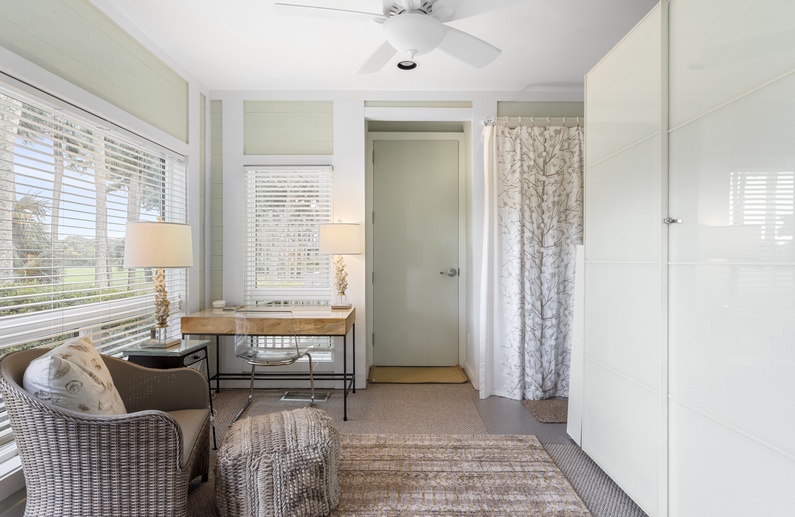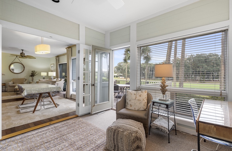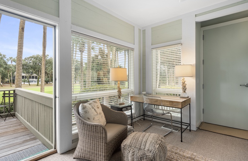 The sunroom offers a writing desk, comfortable seating, gorgeous golf views, and access to the spacious deck.