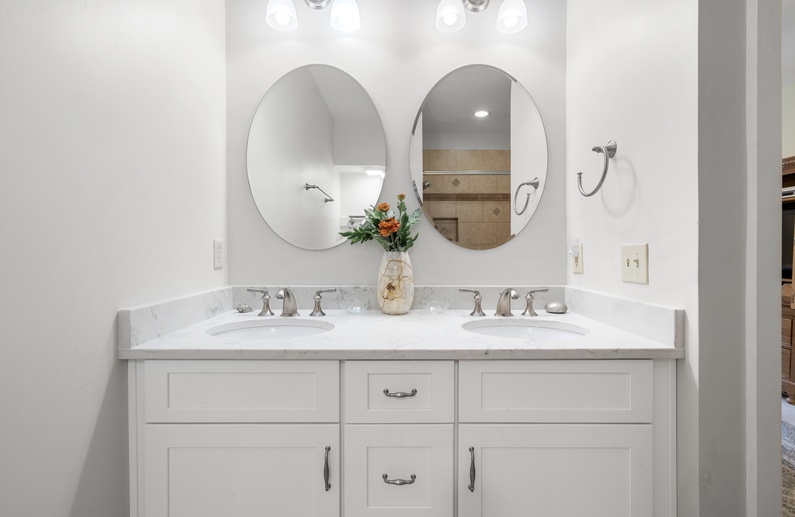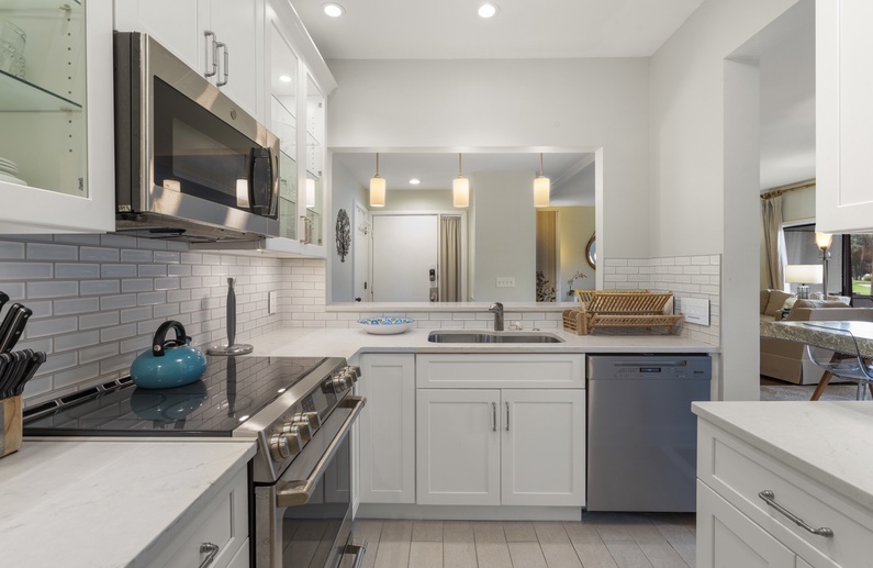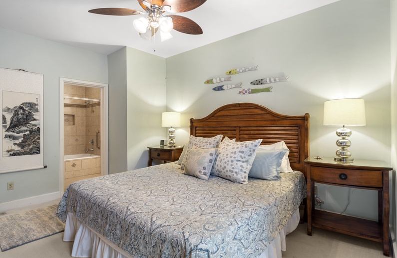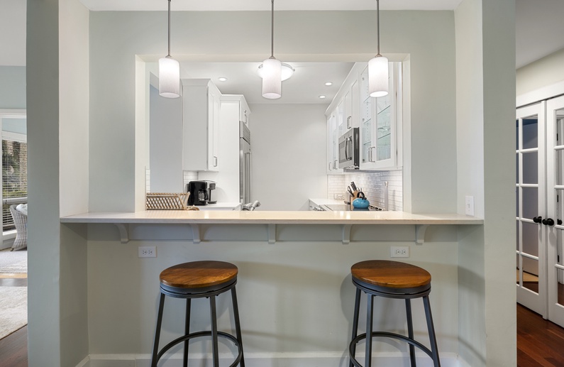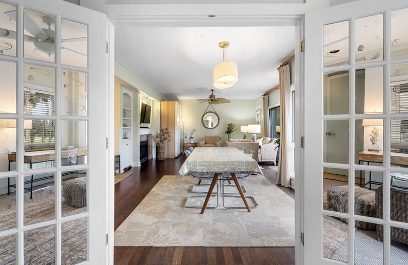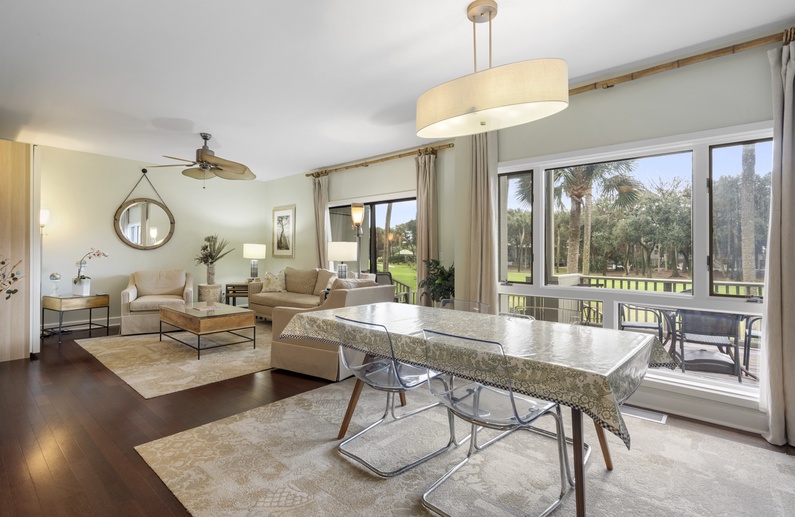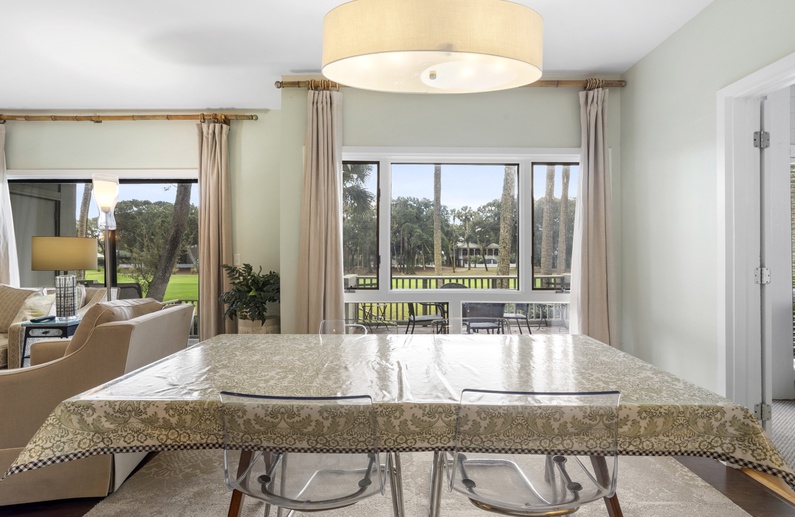 This first-floor villa offers a one-story layout with neutral hues, ample living space, and abundant natural light. In the living area, you will find comfortable seating, a large flat-screen TV, and stunning views of the golf course. The fully equipped kitchen features ample counter space and additional barstool seating to enjoy your vacation meals. The kitchen also opens to the main dining area, where you will find seating for 4 and spectacular golf views.