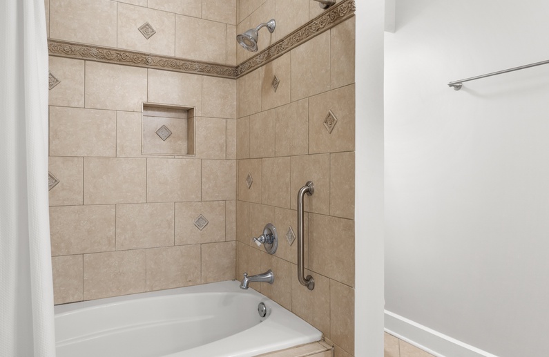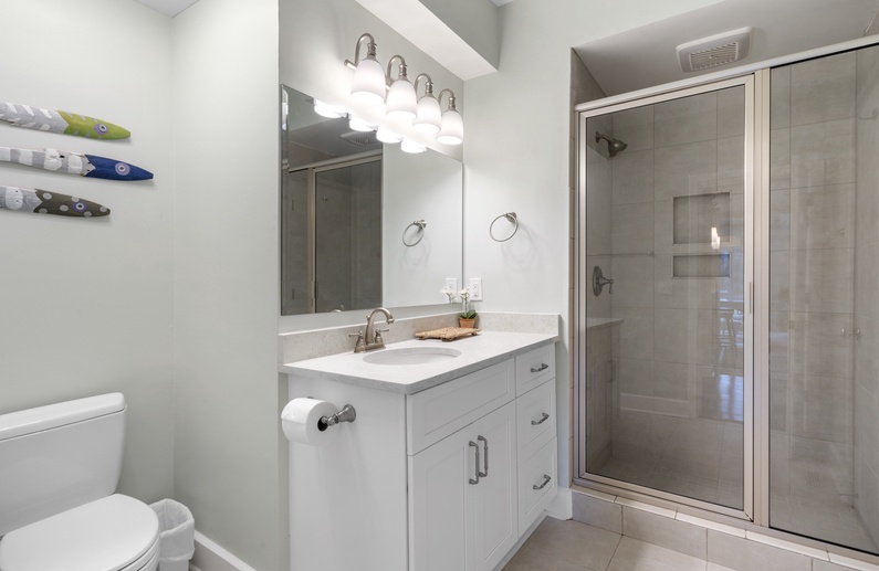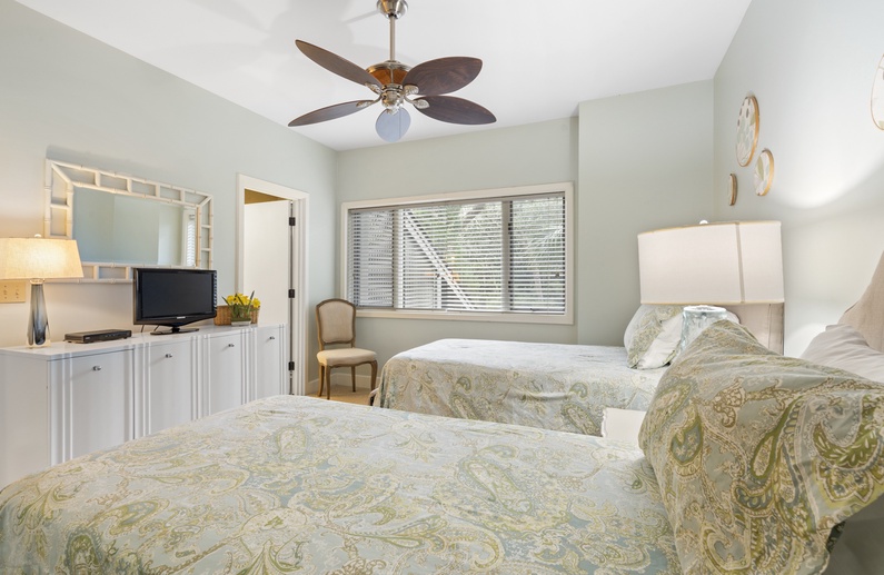 The villa’s primary bedroom features a king-sized bed, a television, deck access, and a private bathroom with a shower and bathtub combination. The second bedroom is perfect for kids as it includes two twin-sized beds, a television, and a private bathroom with a walk-in shower.