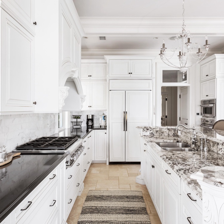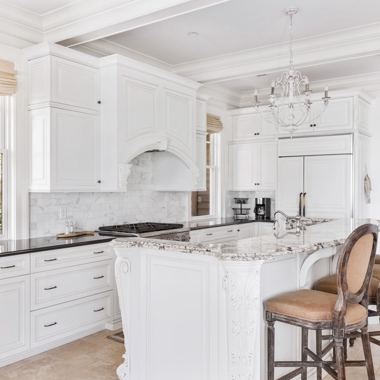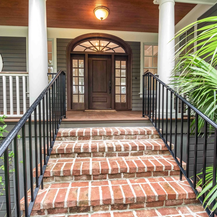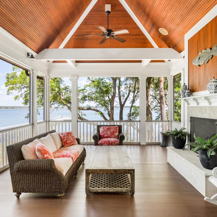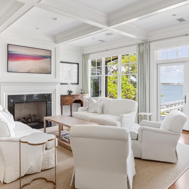 Ascend the grand brick staircase, and you will find yourself on a gracious front porch nestled among nature. Once inside the home, you will immediately notice the breathtaking river vistas that pour through floor-to-ceiling windows. Offering an open floor plan designed to highlight the water views, this home has a seamless flow ideal for gathering. In the living area, you will appreciate the coffered ceilings, comfortable white sofas, and wall-mounted picture frame TV. Fit for a chef, the open kitchen has a large island with bar stool seating, white cabinetry, high-end appliances, and a corner breakfast nook.