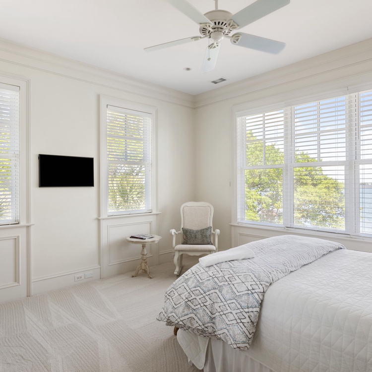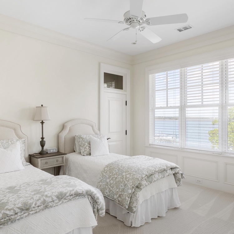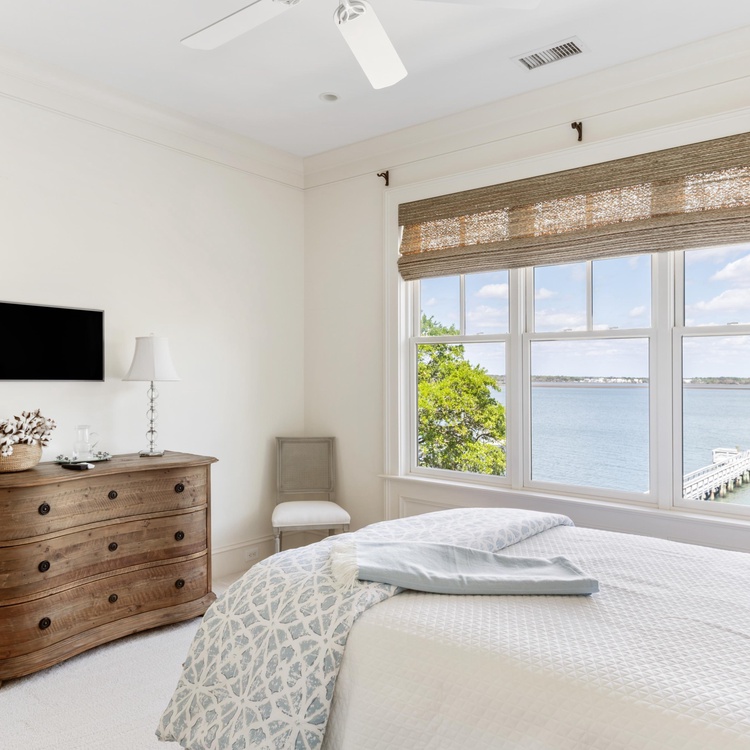 Five bedrooms, all with river views and private bathrooms, invite you to relax and recharge during your vacation. The primary suite is on the main level and provides a king-sized bed, a TV, access to the pool deck, and a luxurious private bathroom with a soaking tub and walk-in shower. Ascend the stairs to the second level, where you will find three additional bedrooms: two with queen-sized beds and one with two twin-sized beds. The third floor houses the final bedroom, which has two twin-sized beds.