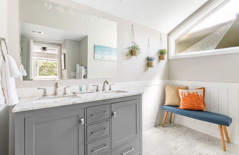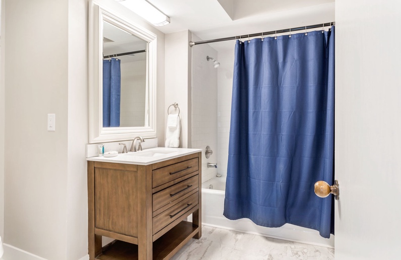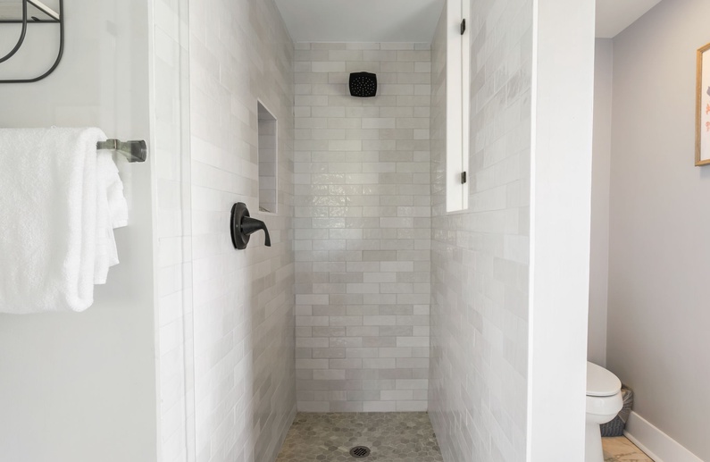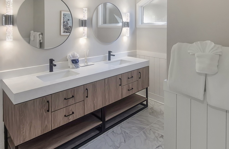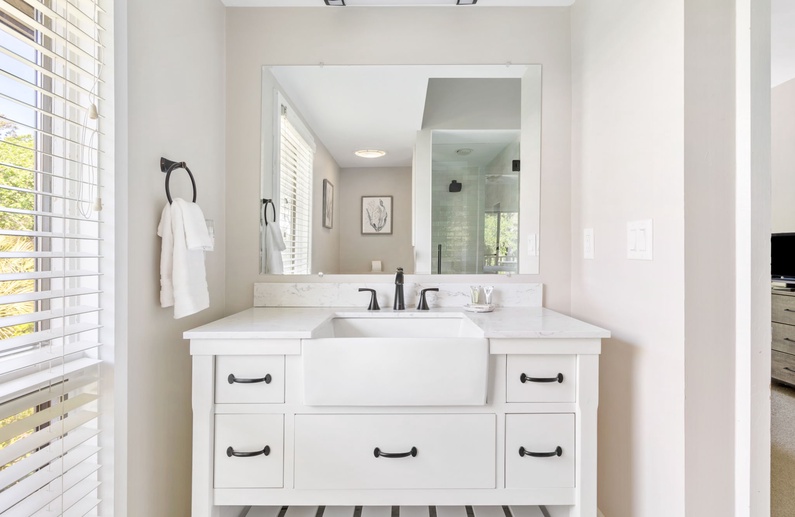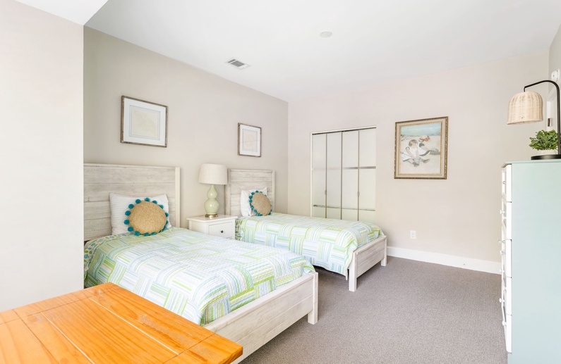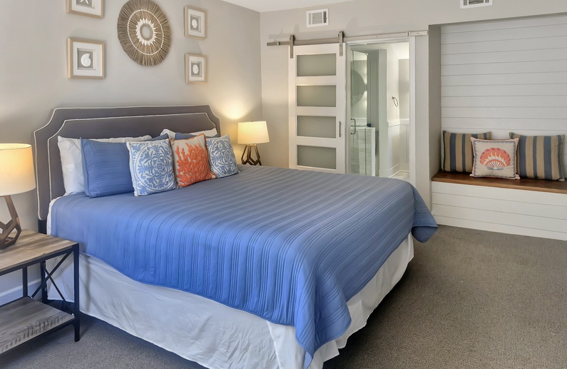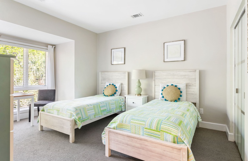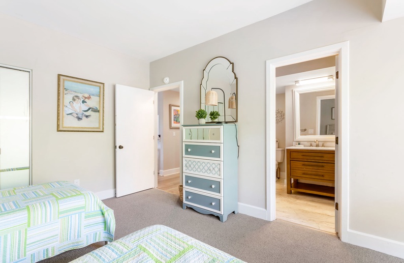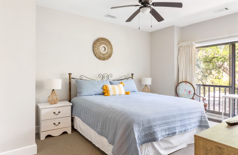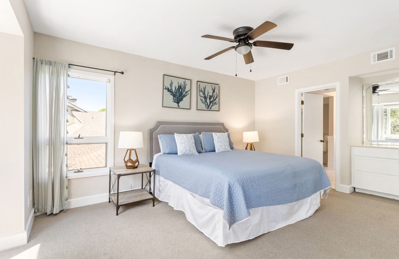 The first primary suite is secluded upstairs and has a king bed and private bathroom with a walk-in shower. Two additional generously sized bedrooms are located on the main floor. The second primary suite features a king bed, balcony, and a private bathroom with a shower. The third bedroom offers two twin beds and easy access to the hall bathroom with a tub/shower combination.