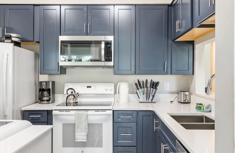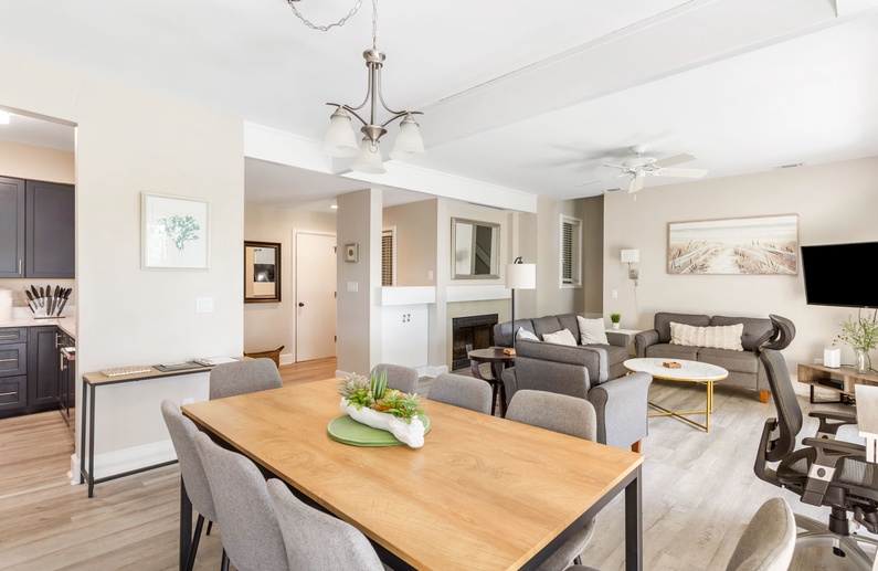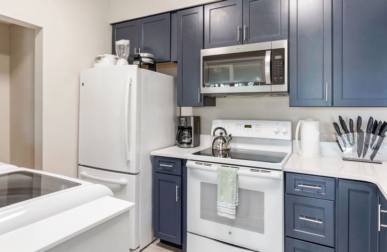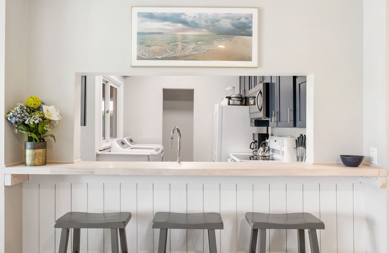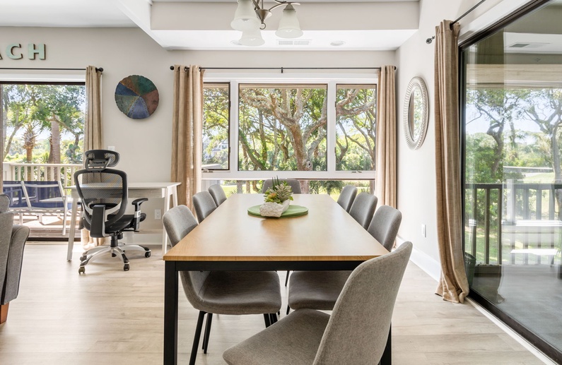 Featuring chic navy cabinets, plenty of counter space, and bar stool seating for three, the villa's kitchen is sure to please the family chef. The adjacent dining area overlooks the golf course and has dining space for six.