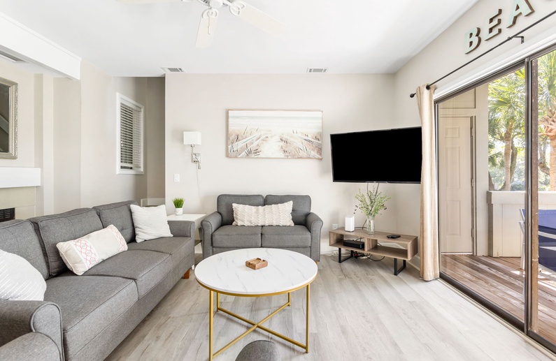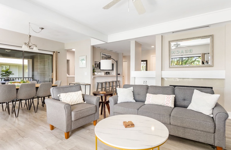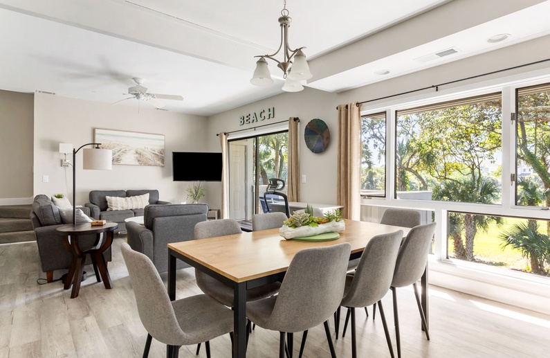 Large windows and sliding glass doors provide an abundance of natural light and highlight the villa's spectacular view of the golf course. Offering plenty of comfortable seating and a wall-mounted TV, the comfortable living area is the perfect place to unwind after a day at the beach. A seamless open floor plan allows for easy flow and conversation between the living room, dining area, and kitchen.