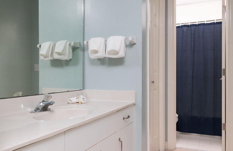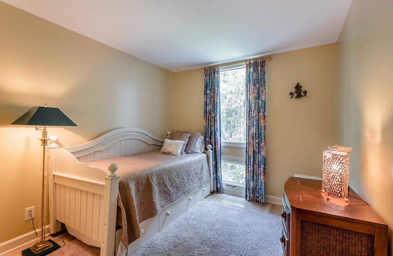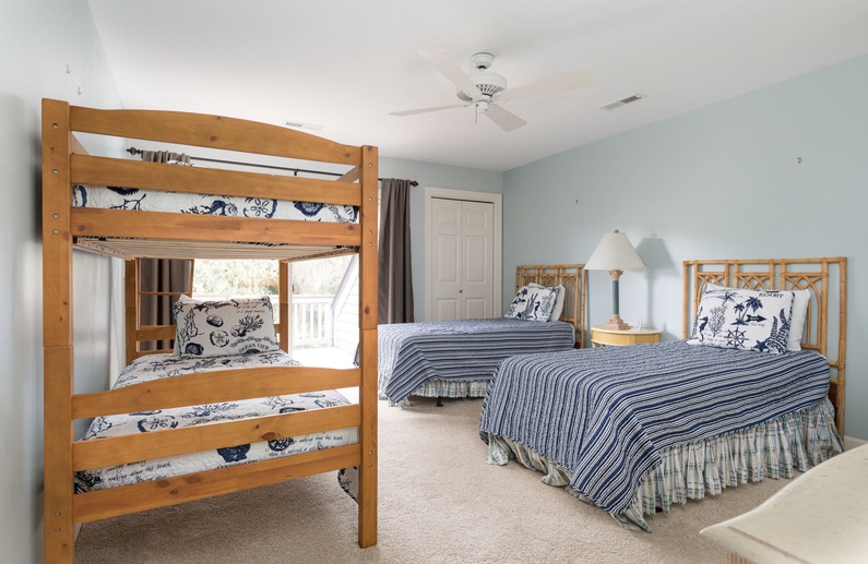 Upstairs, you will find the remaining three bedrooms. One room features a queen bed, another offers two twin beds and a twin over twin bunk bed, perfect for a kids or teen room, and the fifth bedroom offers one twin bed. There are two bathrooms on this floor.