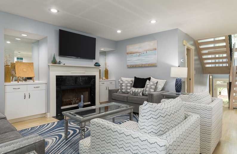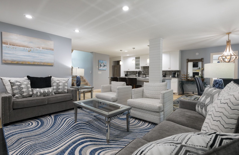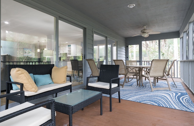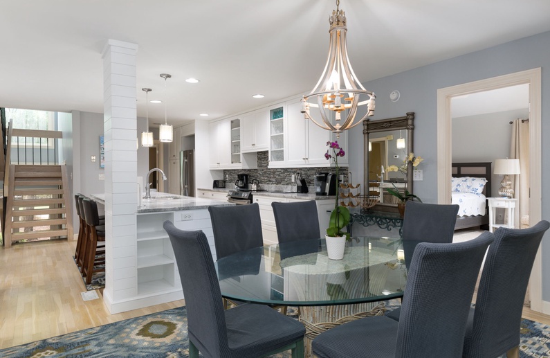 Enter the main level and enjoy the fully equipped, updated kitchen featuring marble countertops, stainless steel appliances, shiplap accents, and a center island that seats 3. The main living area has plenty of comfortable seating with a sofa, loveseat, and 2 chairs. It also features a mounted flat-screen TV perfect for catching a break from the sun. The dining area, with 8 chairs, is a great place for enjoying a family meal together on vacation. Walk out to the large screened porch and see several chairs for lounging and a table and chairs that seats 4. The screened porch is the perfect place for enjoying the breeze, watching wildlife, and sipping your morning coffee or an evening cocktail.