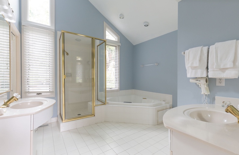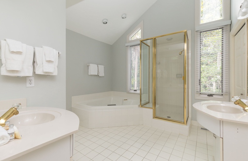 The main level features dual primary suites, each with king-sized beds, private decks, and ensuite bathrooms featuring his and her sinks, jacuzzi tubs, and walk-in showers.