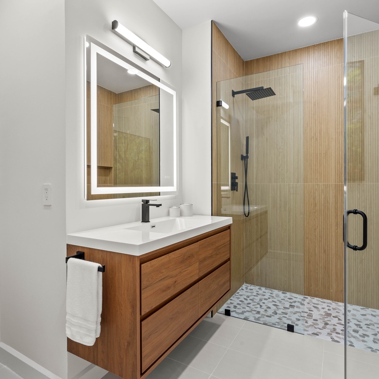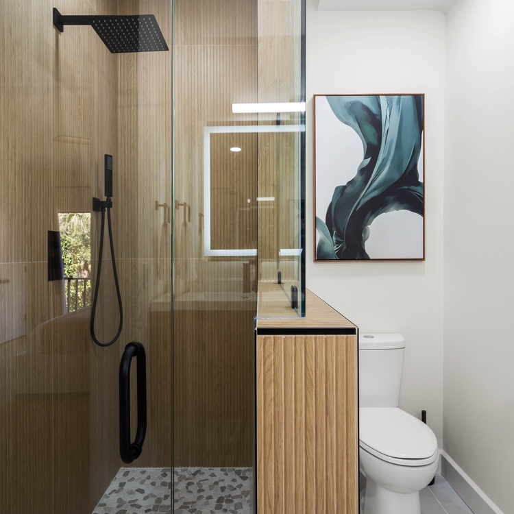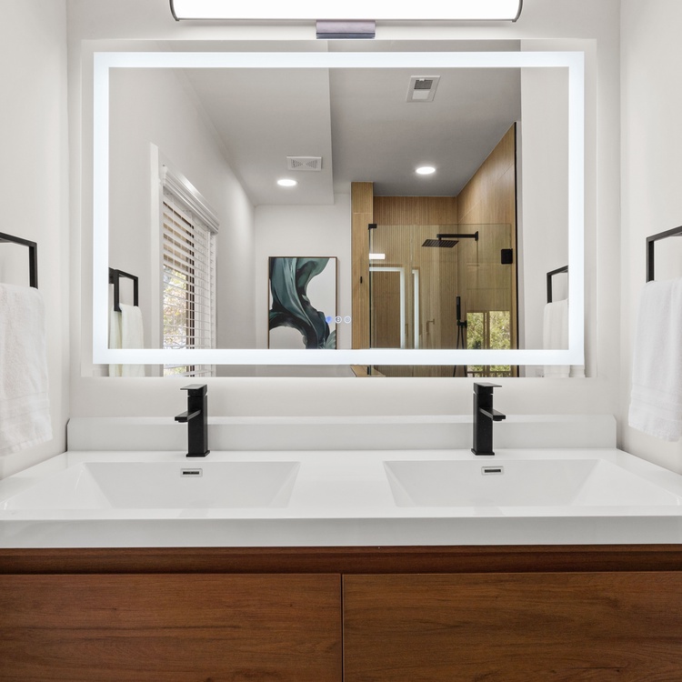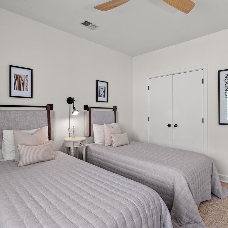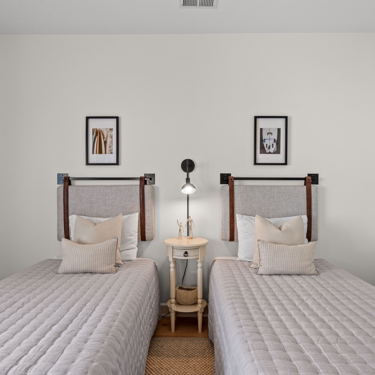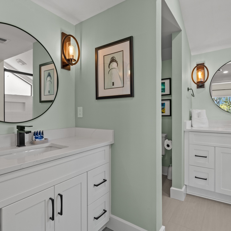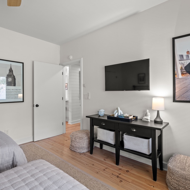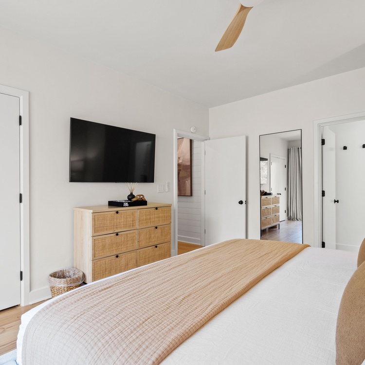 On the main level, two additional bedrooms ensure comfort and privacy. The second primary boasts a king bed, a TV, balcony access, and a private bathroom with a walk-in shower and a double sink vanity. The third bedroom, perfect for friends or children, includes two twin beds, a TV, and convenient access to a hall bathroom with a shower. Both bathrooms were fully renovated in February 2025.