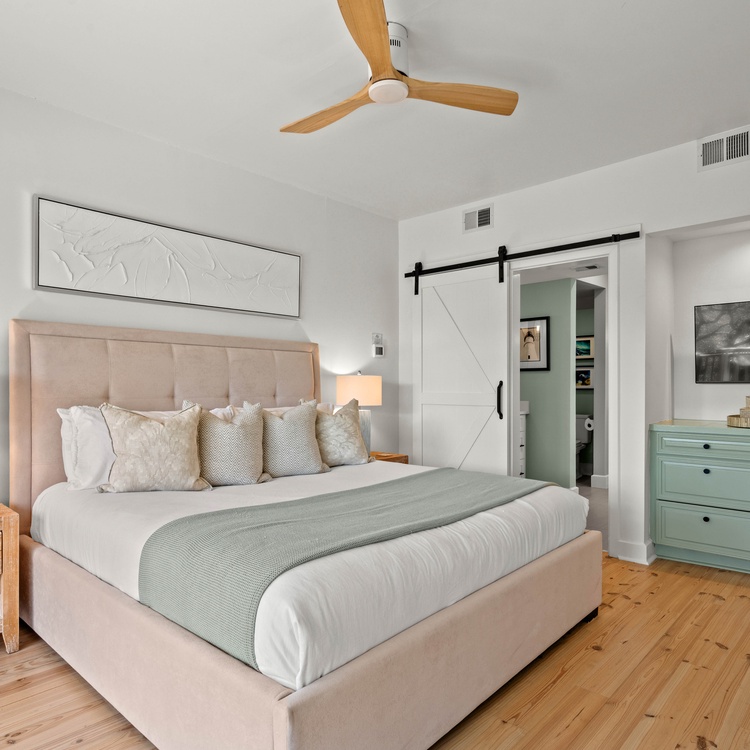 Ascend the stairs from the living room to discover the secluded primary suite. This haven not only offers breathtaking golf and lagoon views from its private balcony but also features a luxurious king bed, a TV, and an ensuite bathroom equipped with double sinks and a spacious walk-in shower. As a major bonus, the primary bedroom has its own thermostat.