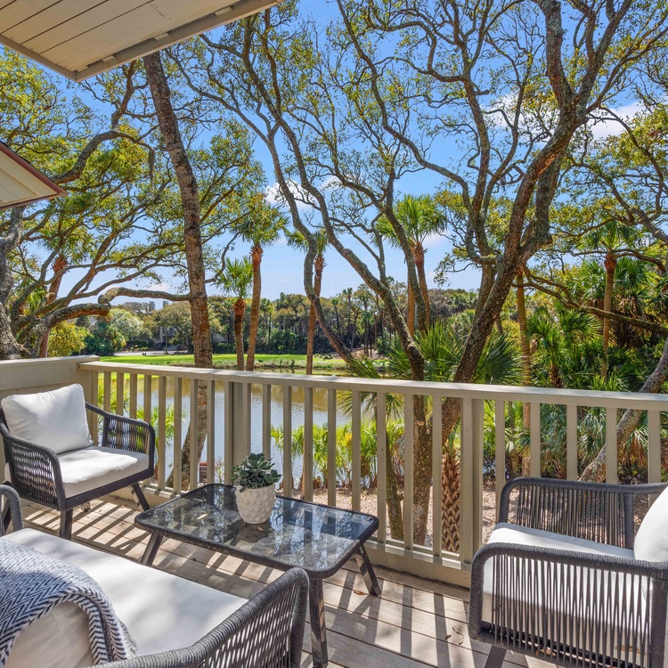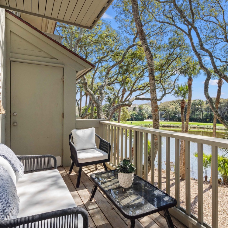 Step outside to the villa's back deck and immerse yourself in the stunning views of the golf course and lagoon. This outdoor sanctuary is perfectly designed for relaxation, featuring a sofa, two chairs, and a coffee table, making it an ideal spot to unwind and savor the tranquil surroundings.