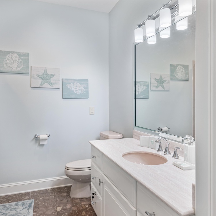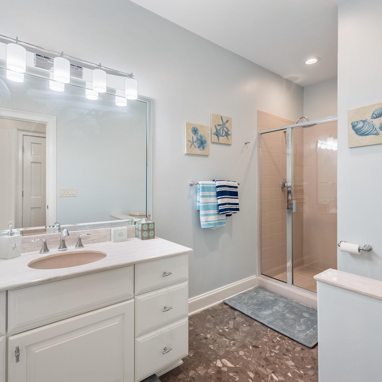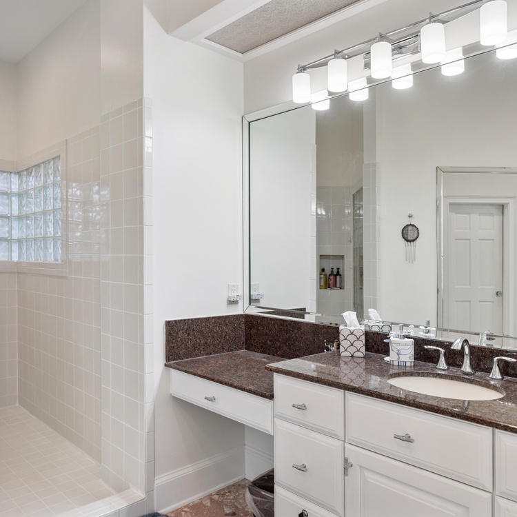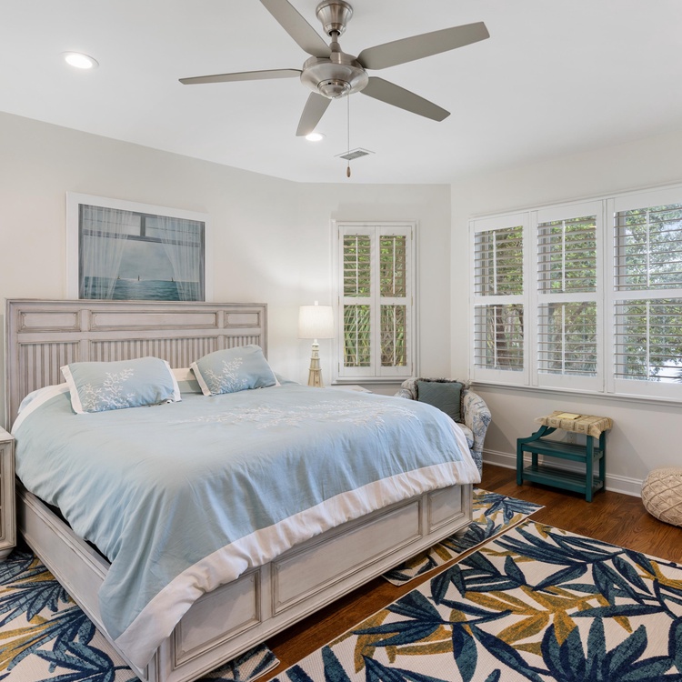 This home features four comfortable bedrooms, each with an en suite bathroom. The spacious main-floor primary suite is a luxurious retreat with a king-sized bed, TV, access to the pool deck, and breathtaking water views. In the private bathroom, guests will appreciate his-and-hers vanities, a relaxing soaking tub, and a large walk-in shower. Down the hall, you will find a light-filled second bedroom with a queen-sized bed and a private bathroom with a shower/tub combo. Ascend the stairs to find the two remaining bedrooms. The first upstairs bedroom has a king-sized bed, incredible views, a TV, and a bathroom with a walk-in shower. The final bedroom has a king-sized bed, TV, and a bathroom with a shower/tub combo.