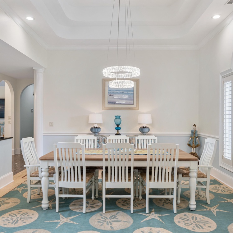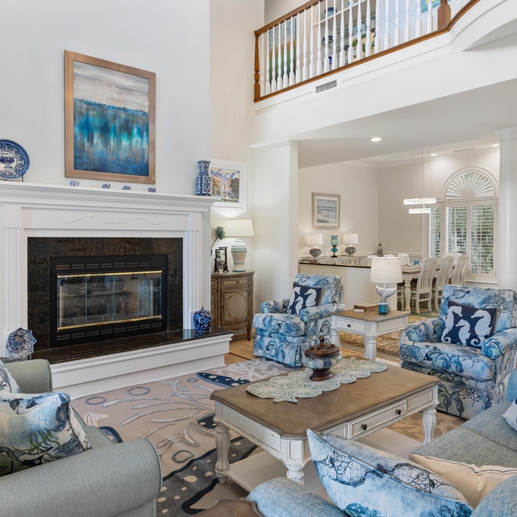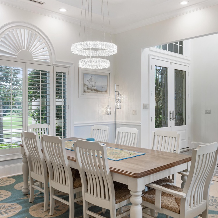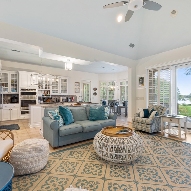 Back inside, an open floor plan provides easy flow between the formal dining room, living spaces, and kitchen. The first living area features lofty two-story ceilings, a wet-bar area, and comfortable sofas overlooking the golf course and lagoon. An open formal dining area serves as the perfect place to gather for meals with your loved ones.