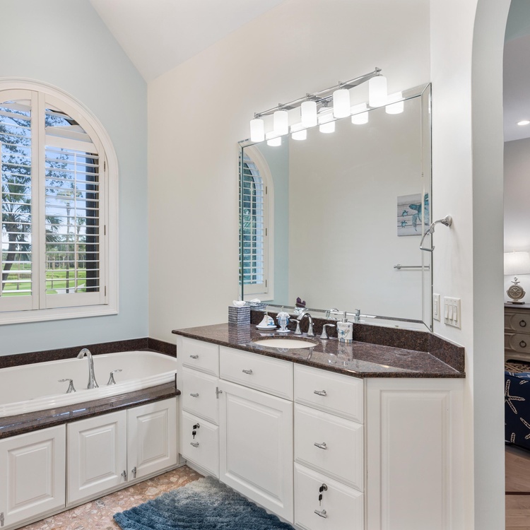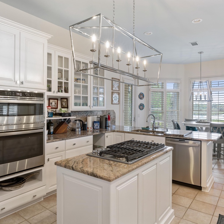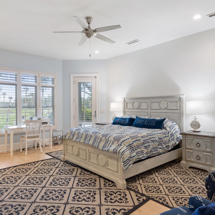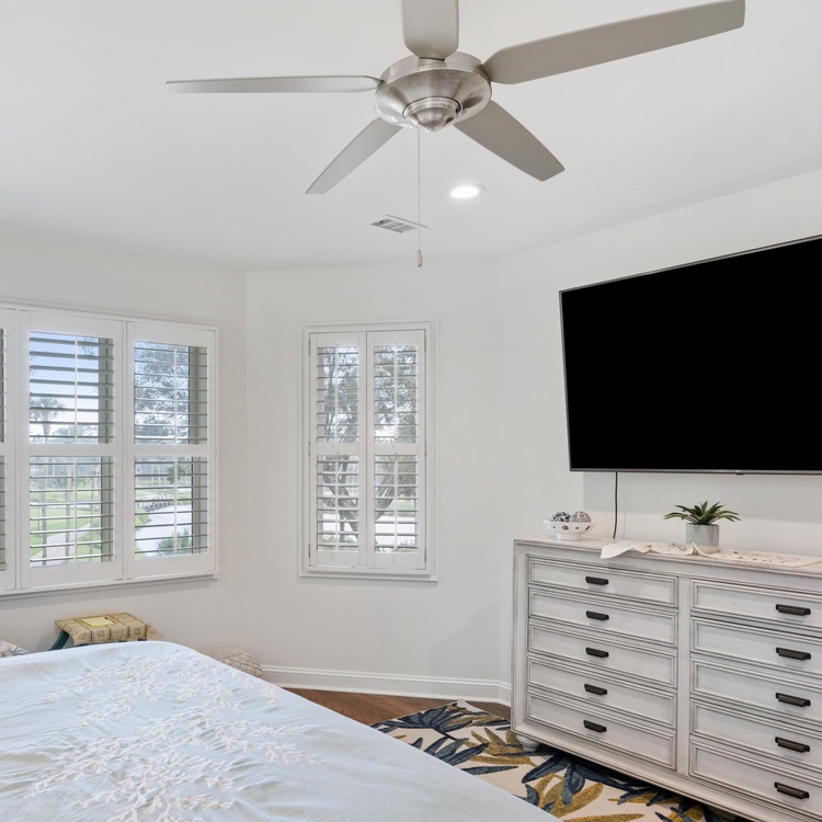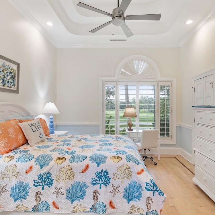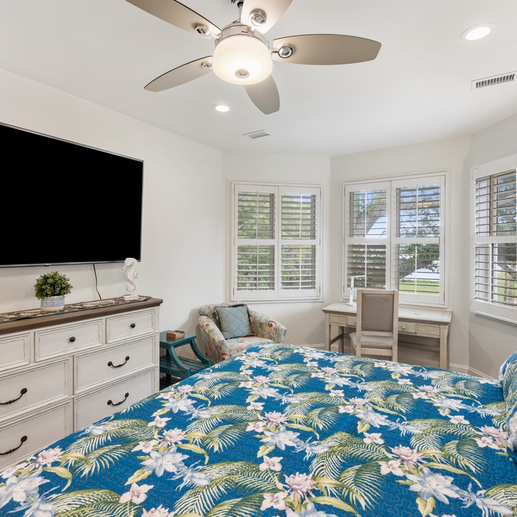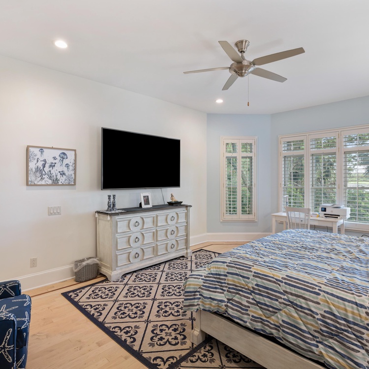 Proceed into the completely renovated kitchen, where you will find custom cabinetry, stainless steel appliances, bar stool seating, and a breakfast nook with seating for four. Open to the kitchen, the second family room provides ample seating, including a queen sleeper sofa, and a large wall-mounted TV. Here, lounge in comfort while enjoying breakfast and expansive views of the lagoon and golf course through large windows.