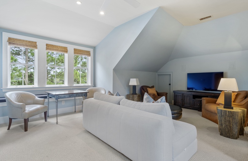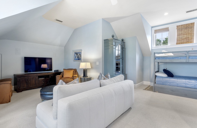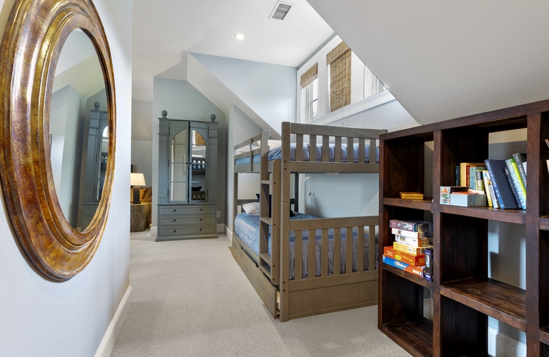 Ascend the foyer steps to reach the second floor and its four bedrooms. The second-floor suite features a king bed, sitting area, and private bathroom with double vanities and a shower. A second bedroom offers a king bed, flat-screen TV, and private bathroom, a third bedroom offers a queen bed, flat-screen TV, and private bathroom, and a fourth bedroom has two queen beds and a private bathroom. Stairs lead you to the third-floor bedroom with a twin over twin bunk, armchair seating, large flat-screen TV, four-person table perfect for games, and a convenient bathroom.
