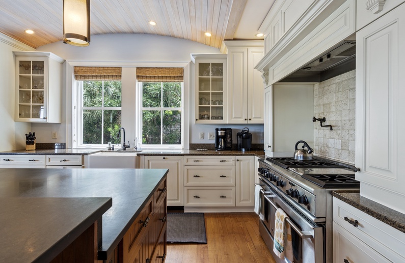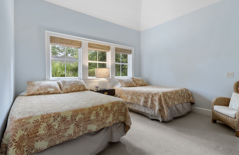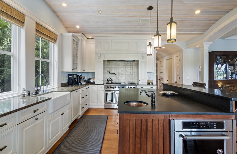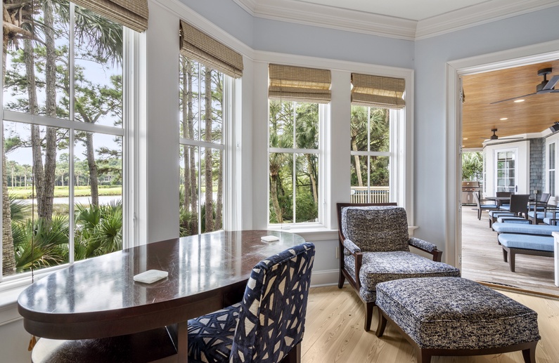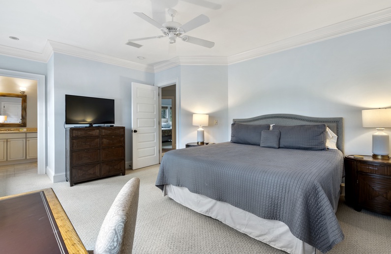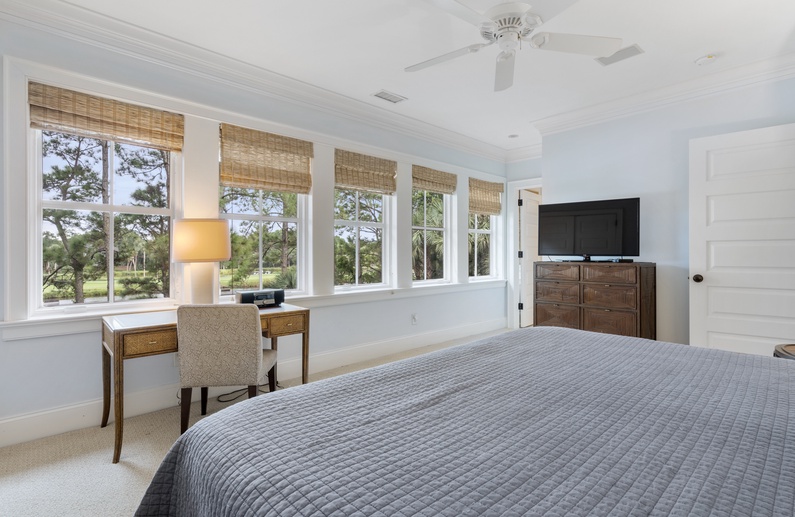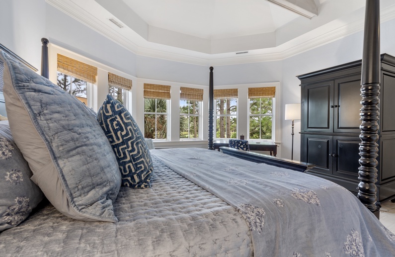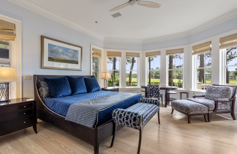 The home welcomes you with hardwood flooring, wainscoted walls, and arched ceilings. The living room offers a central sitting area with ample seating as well as a cozy sitting area for two, both complemented by a coffered ceiling and wall of windows leading to the pool deck and beautiful views. The light-filled kitchen features white cabinetry contrasted by dark countertops, a large island with bar stool seating, and convenient breakfast area for four. Adjacent to the kitchen, you’ll find a round dining table with seating for eight. The main floor primary suite offers a king bed, sitting area, and spacious bathroom with double sinks, shower, and soaking tub. The laundry room and powder complete the main floor.