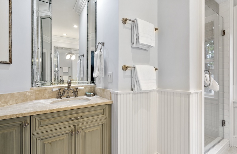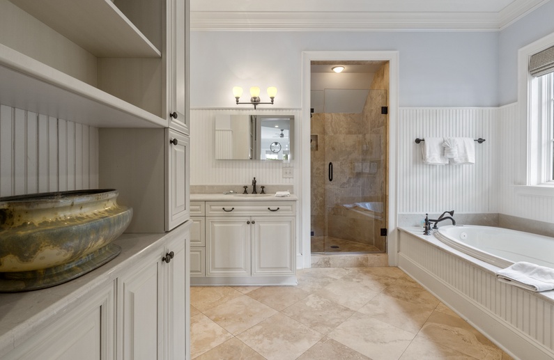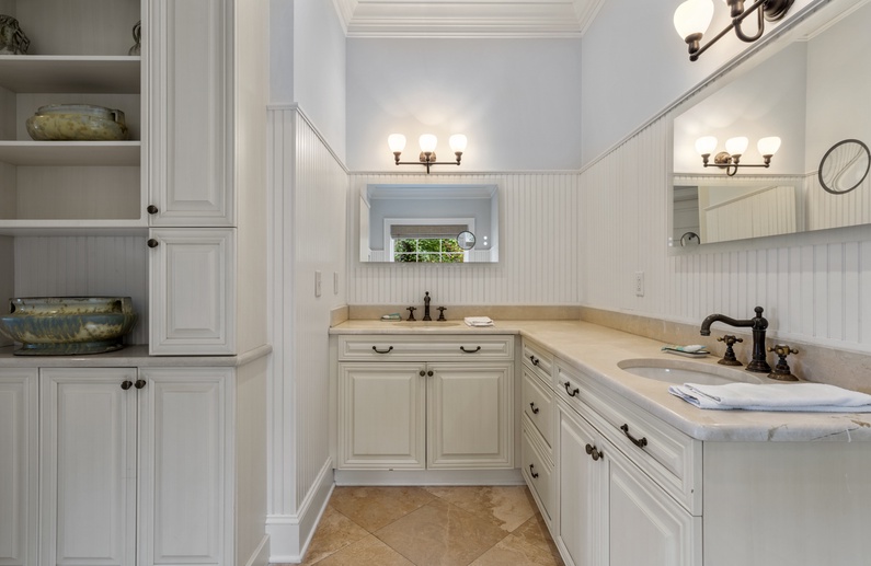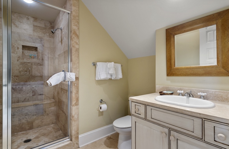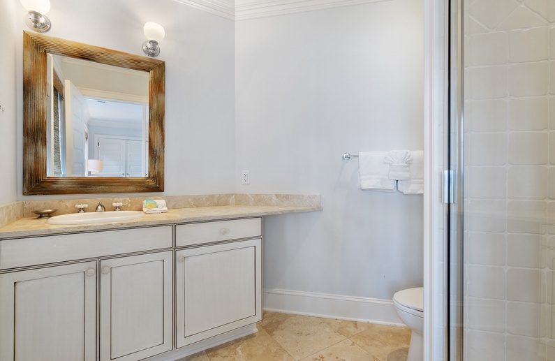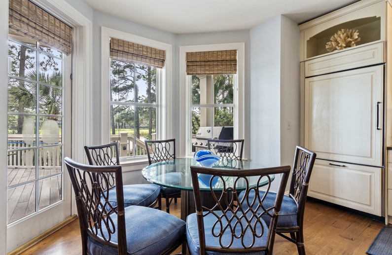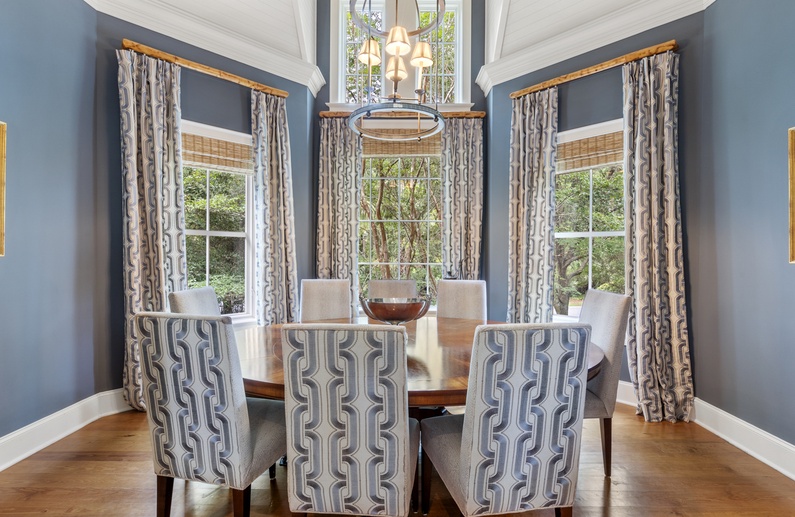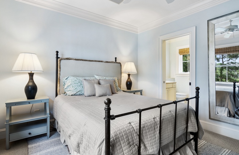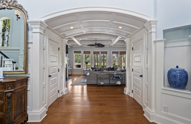 The home welcomes you with hardwood flooring, wainscoted walls, and arched ceilings. The living room offers a central sitting area with ample seating as well as a cozy sitting area for two, both complemented by a coffered ceiling and wall of windows leading to the pool deck and beautiful views. The light-filled kitchen features white cabinetry contrasted by dark countertops, a large island with bar stool seating, and convenient breakfast area for four. Adjacent to the kitchen, you’ll find a round dining table with seating for eight. The main floor primary suite offers a king bed, sitting area, and spacious bathroom with double sinks, shower, and soaking tub. The laundry room and powder complete the main floor.