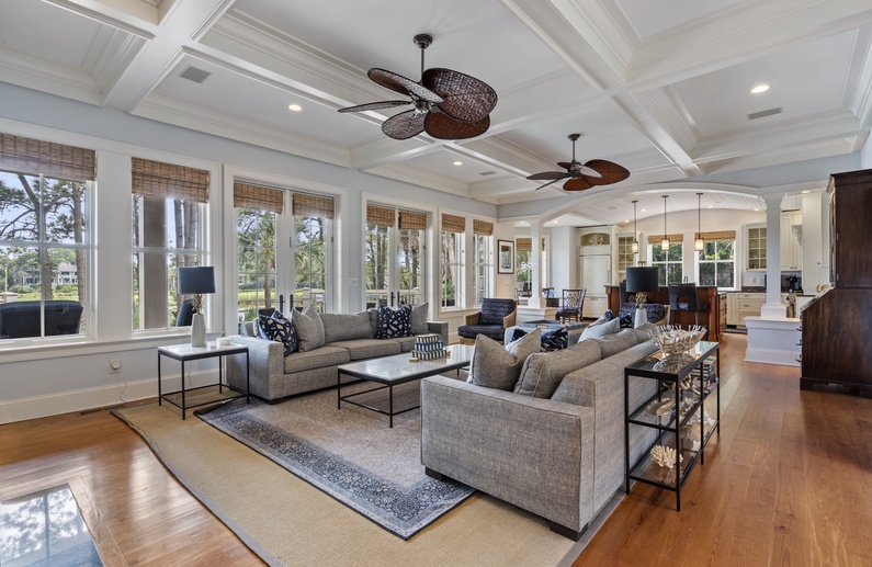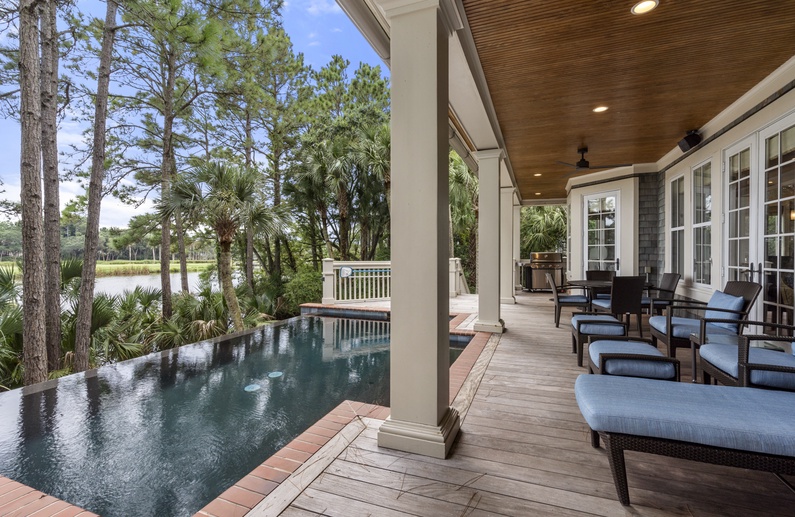 This luxury Kiawah Island vacation rental boasts a spacious interior with six bedrooms, a private pool, picturesque golf and lagoon views, and a short bike ride to the beach.