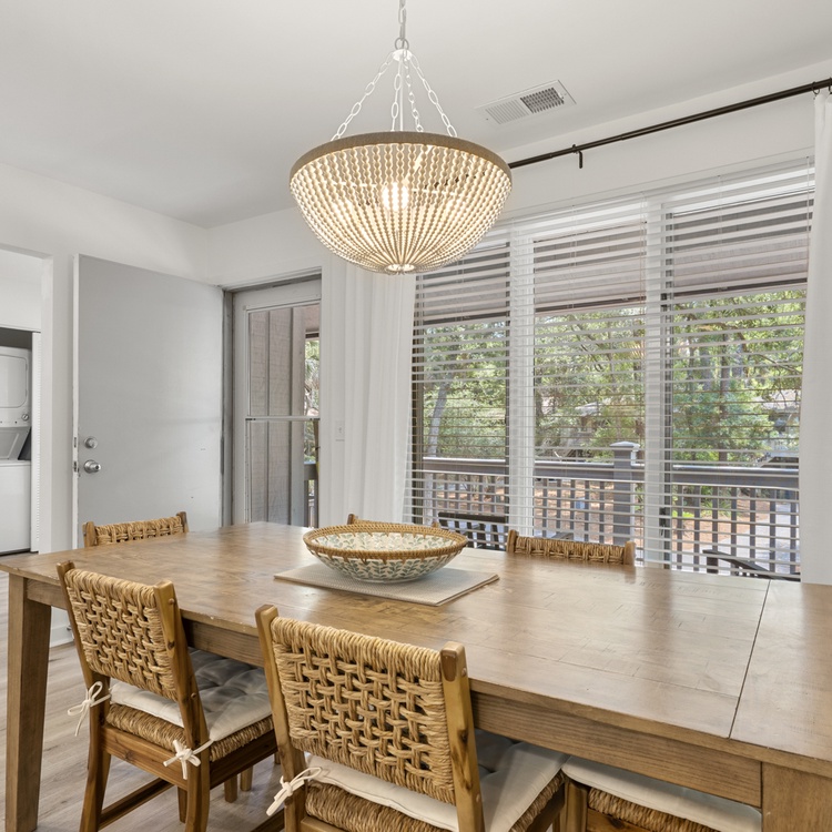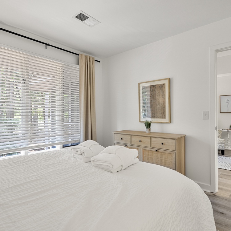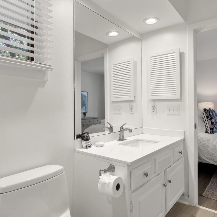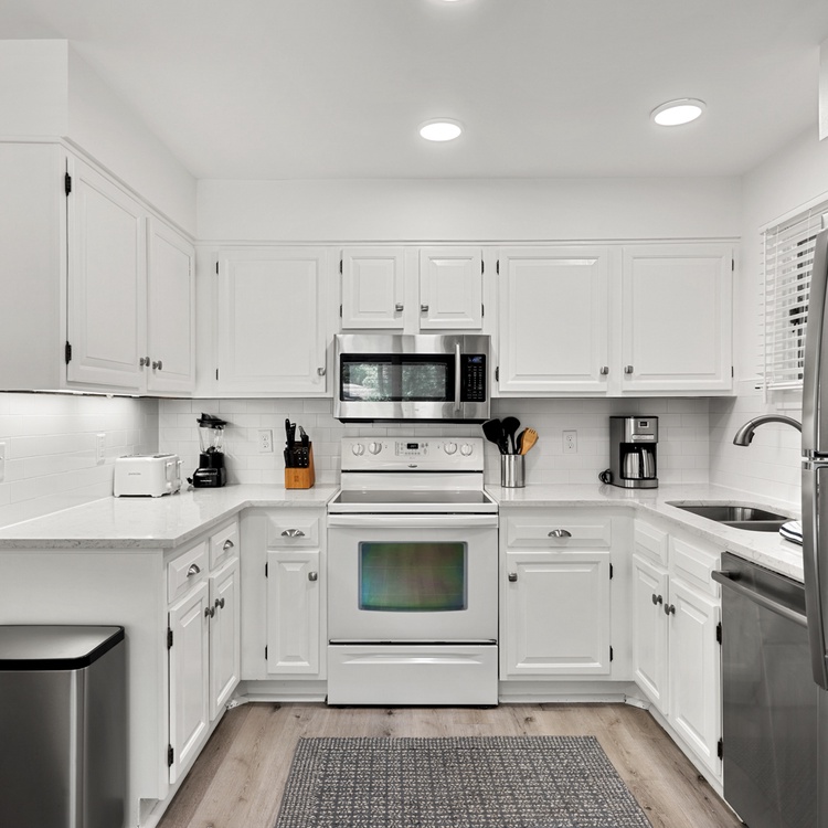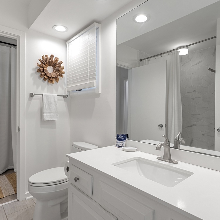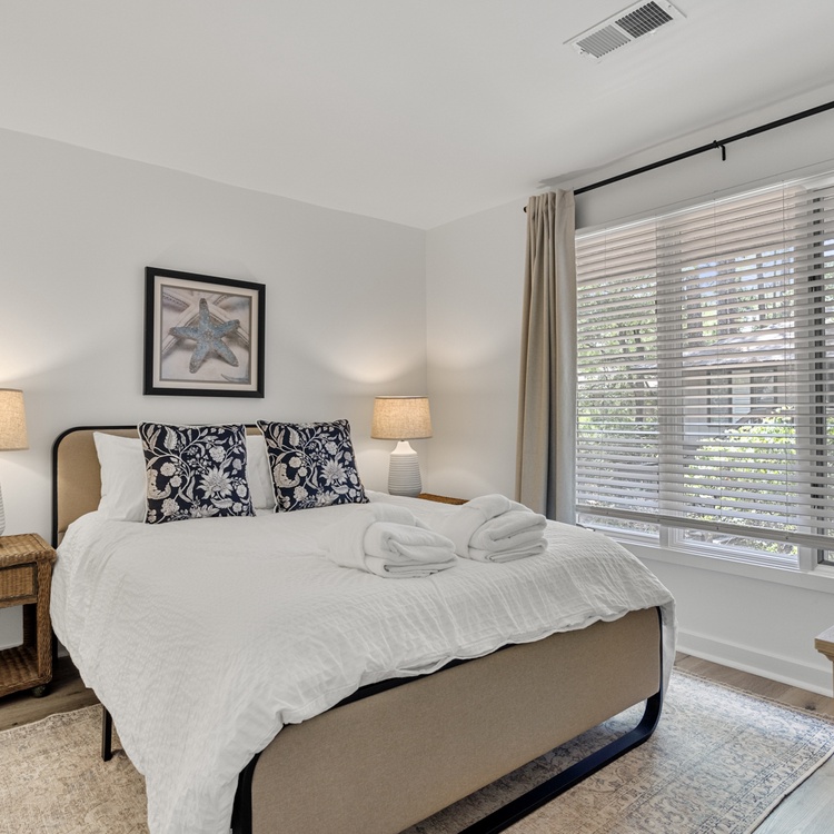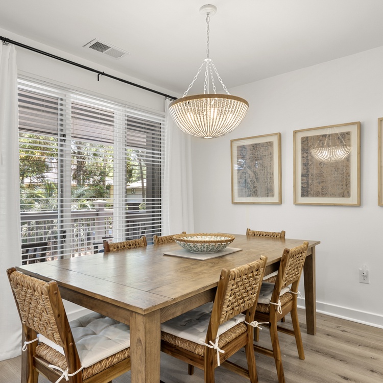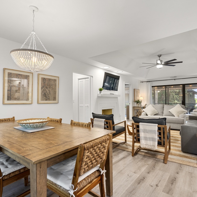 The cottage features beautiful hardwood flooring, soft neutral hues, and an abundance of natural light. The living area offers comfortable seating, a flat-screen TV, a cozy reading nook, and access to the spacious screened porch. The kitchen area features beautiful white cabinetry and enough counter space to prepare your vacation meals. The dining room area offers ample seating for your whole party and is the perfect entertainment space with its close proximity to the kitchen area and wet bar.