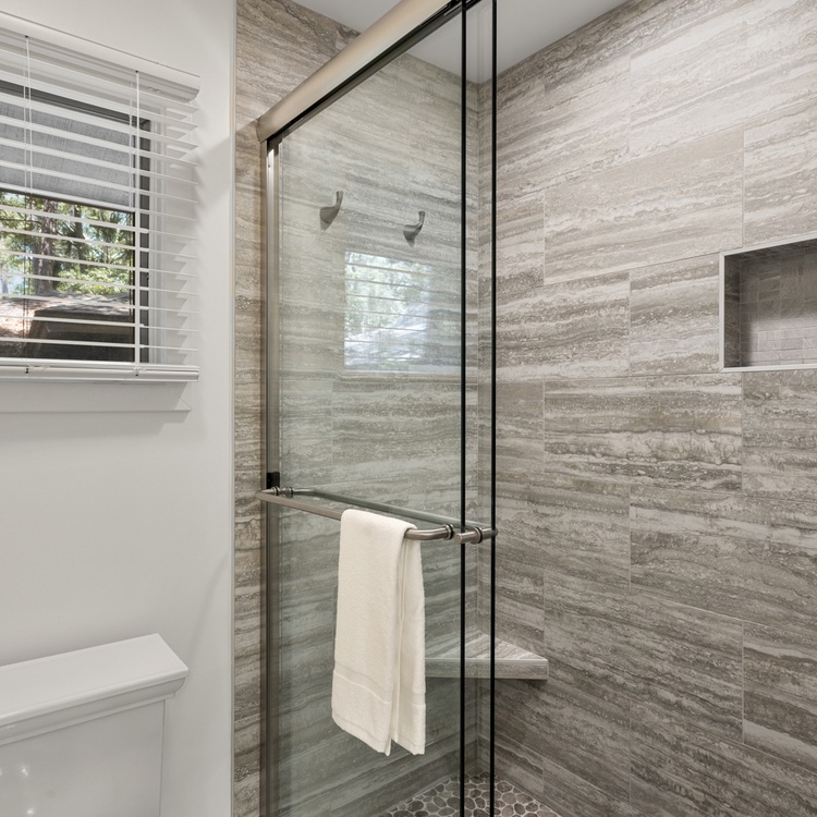 The private primary bedroom features a king-sized bed, a TV, access to the sundeck, and a private primary bathroom. The primary bathroom offers a beautiful glass walk-in shower.
