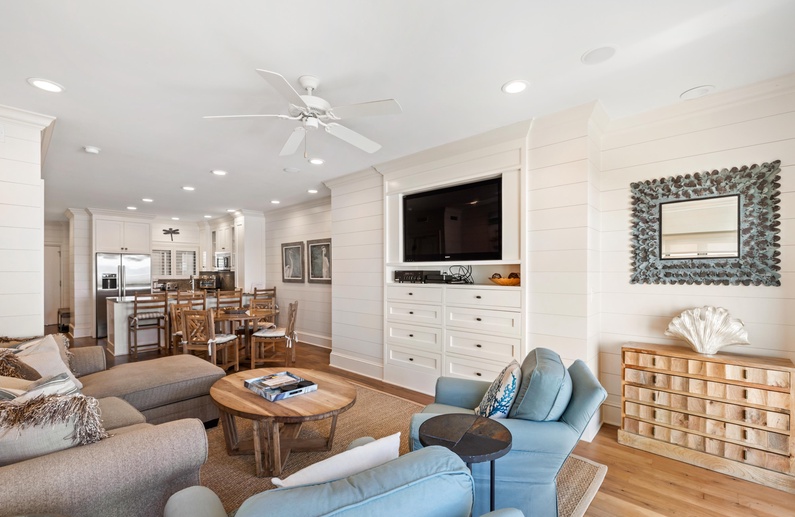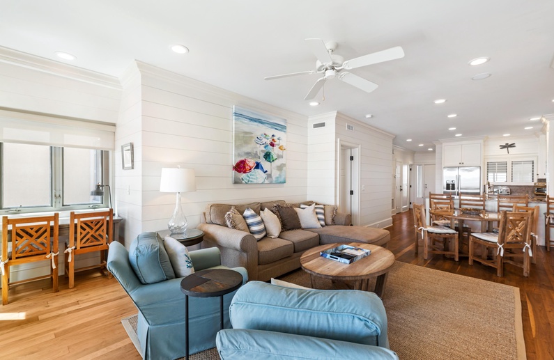 The main living space features an open kitchen, dining, and living area, which opens to the covered deck. The kitchen offers custom cabinetry, beautiful granite countertops and backsplash, and stainless steel appliances. The kitchen bar seats four and the dining table seats four. The living area features a large sofa, two cozy side chairs, and wall-mounted flat-screen TV. The oceanfront covered deck with Adirondack chairs is accessible from the living area. The oceanview primary suite offers a king bed, comfortable side chair, wall-mounted flat-screen TV, and private bathroom with double vanities and a luxury tiled shower with rain head. The second bedroom features a twin over queen bunk bed, wall-mounted flat-screen TV, leather chair and ottoman, and private bathroom with double sinks, extra vanity area, and bathtub/shower combination.