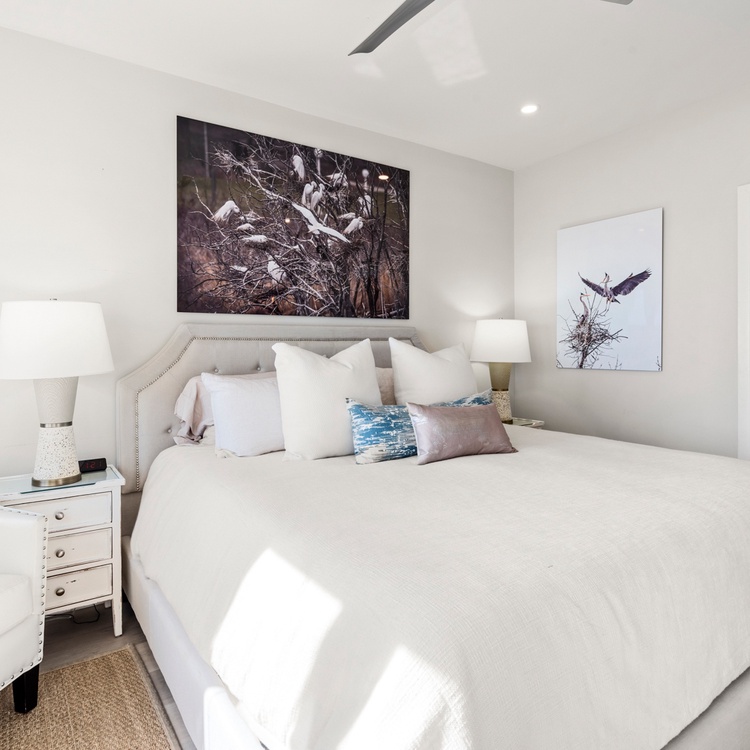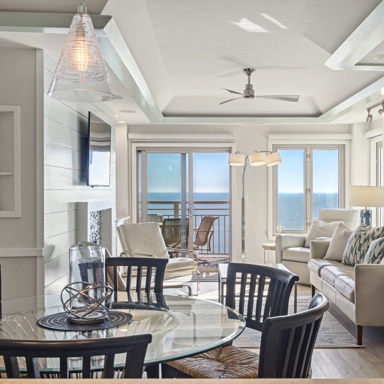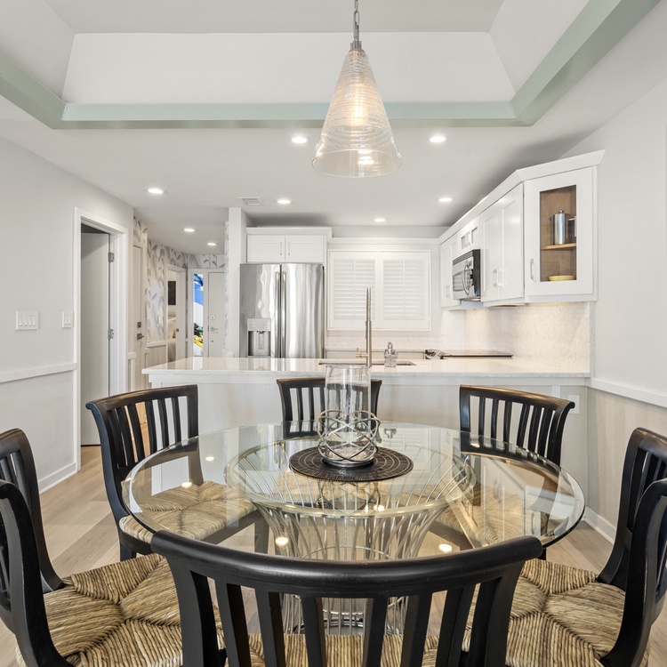 Upon entering this villa, you’ll find spectacular ocean views, an abundance of natural light, and soft coastal hues. The living area features comfortable seating, a flat-screen TV, and sliding door access to the balcony. Enjoy the reading nook as a relaxing space to read or sip morning coffee. The fully equipped kitchen offers gorgeous white cabinetry, stainless steel appliances, and plenty of counter space to entertain. The dining area also offers ocean views and plenty of seating for your whole party.