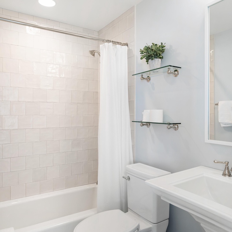 The oceanview primary bedroom features a king-sized bed, access to a private balcony, and an ensuite bathroom with a walk-in shower. Down the hall, you will find the other two bedrooms, also with ocean views. The first bedroom offers a king-sized bed, access to a shared oceanview balcony, and an attached bathroom with a walk-in shower. The second bedroom has two twin beds, also has access to the shared oceanview balcony, and an attached bathroom with a shower/tub combo.