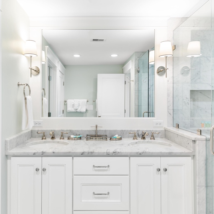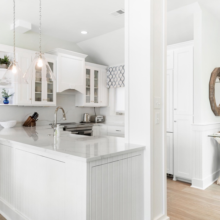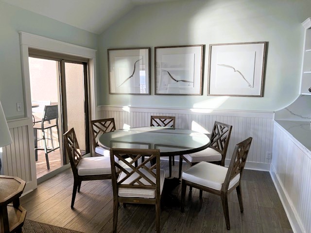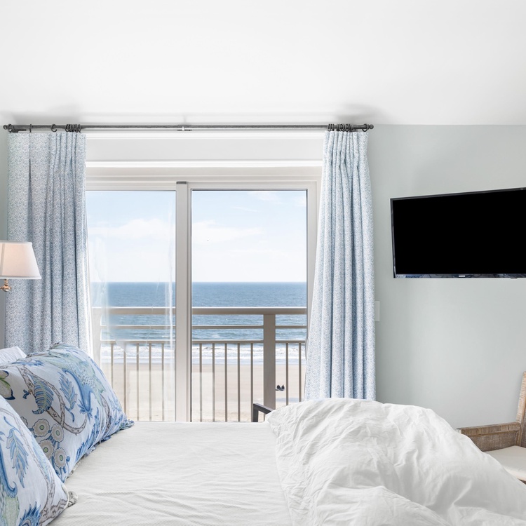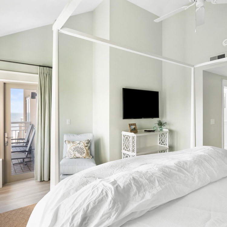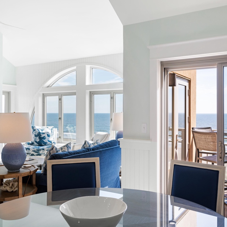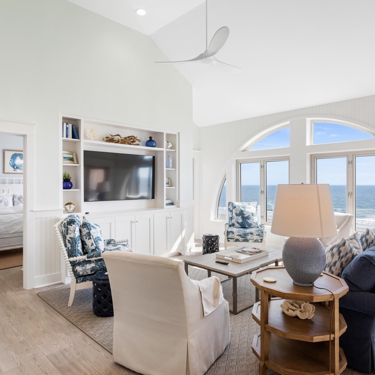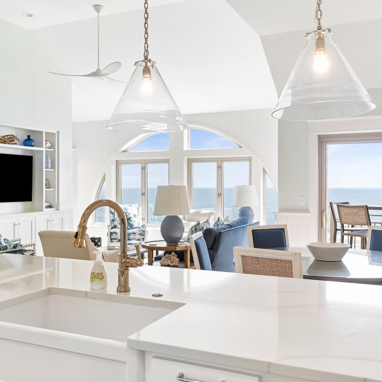 Upon entering this newly renovated top-floor villa, you will immediately notice the sweeping ocean views through the arched living room windows. The living room offers plenty of comfortable seating, a TV, and stylish coastal decor. Prepare your vacation meals while taking in dazzling views of the ocean! The fabulously renovated kitchen features a crisp white aesthetic, stainless steel appliances, and quartz countertops. Enjoy your meals and snacks at the adjacent dining area or step outside and dine on the oceanview balcony.