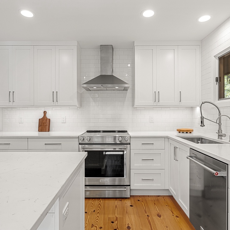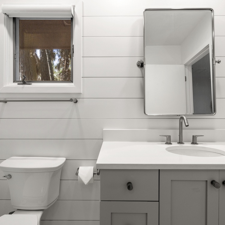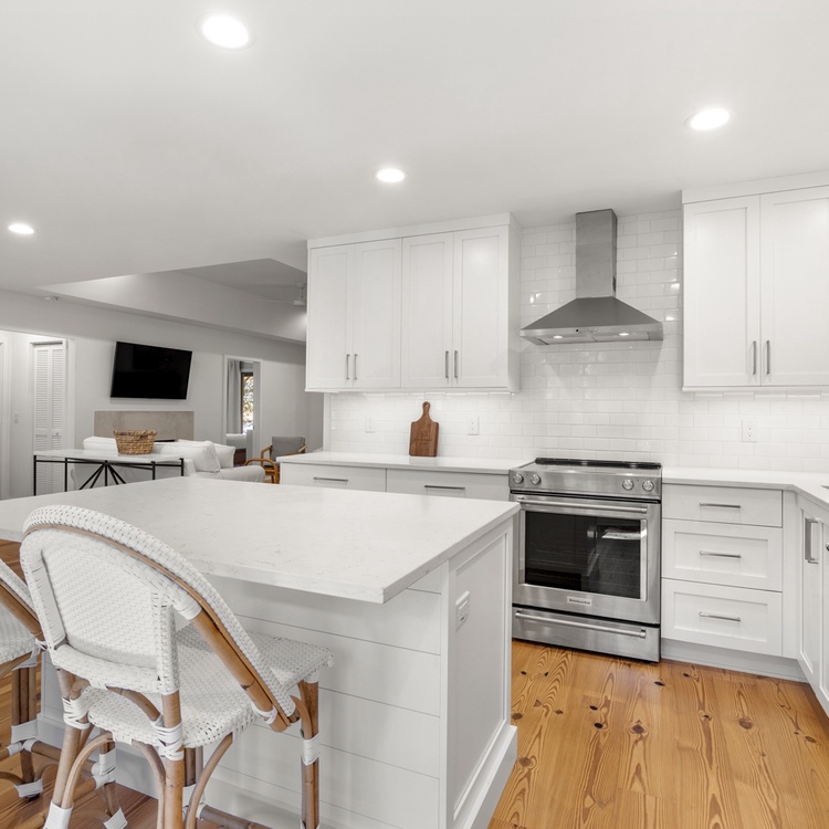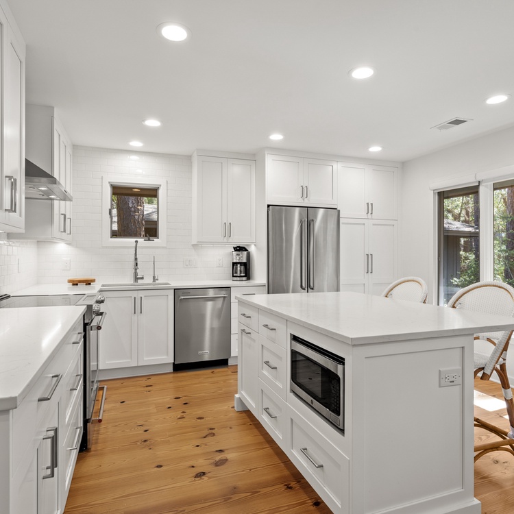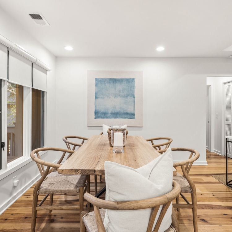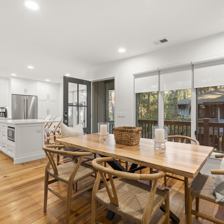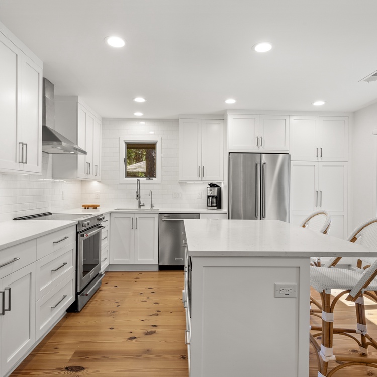 The cottage features neutral hues, soft finishes, and an abundance of natural light. The living area offers comfortable seating, a flat-screen TV, a desk charging station for electronics, and access to the spacious sunroom. The fully equipped kitchen features new KitchenAid appliances, gorgeous white cabinetry, a water-filtered sink, and a center island with barstool seating. The dining room area offers ample seating for your whole party and is the perfect entertainment space with its close proximity to the kitchen area.