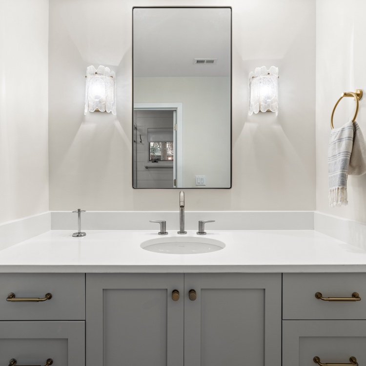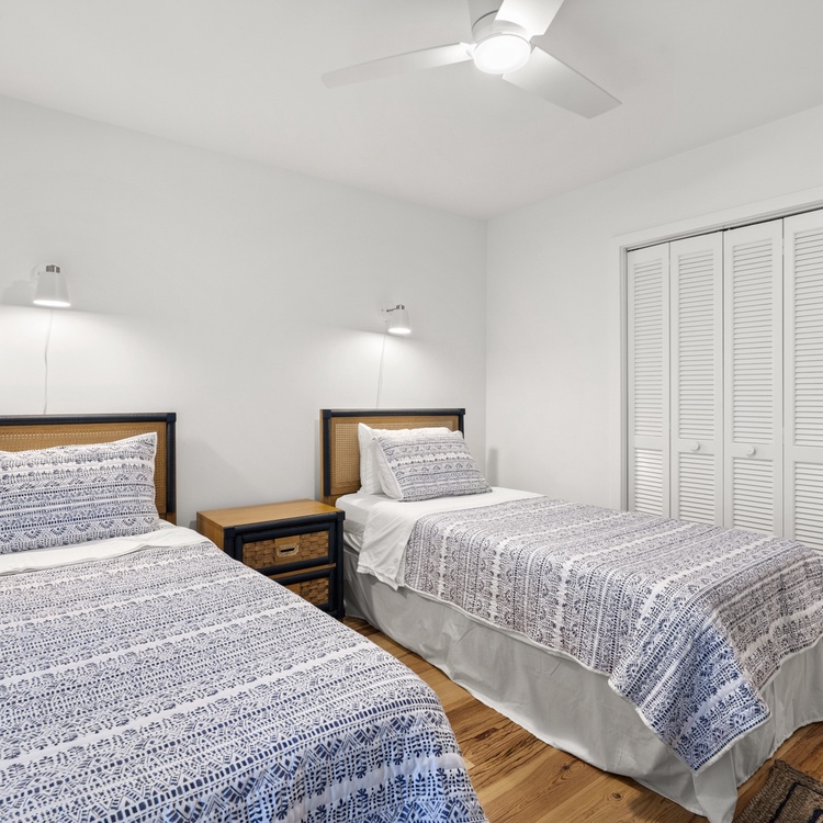 The third bedroom offers 2 Cocoon XL twin-sized beds (can be converted to 1 king-sized bed by request), Summer Waffle Weave blankets, and ample closet space. The closest bathroom is the secondary bathroom, accessible from the hall.