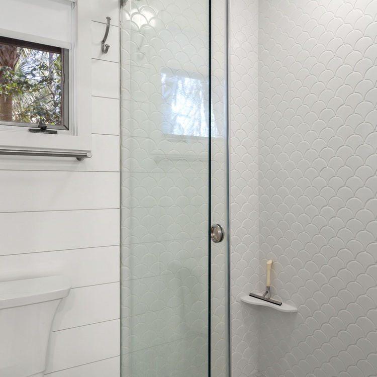 In the primary bedroom, you will find a king-sized bed with Tommy Bahama bedding and Summer Waffle Weave blankets, scenic views, sliding door access to the back deck, and a private primary bathroom with a glass walk-in shower.