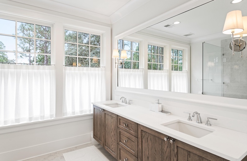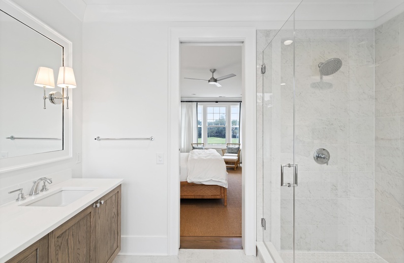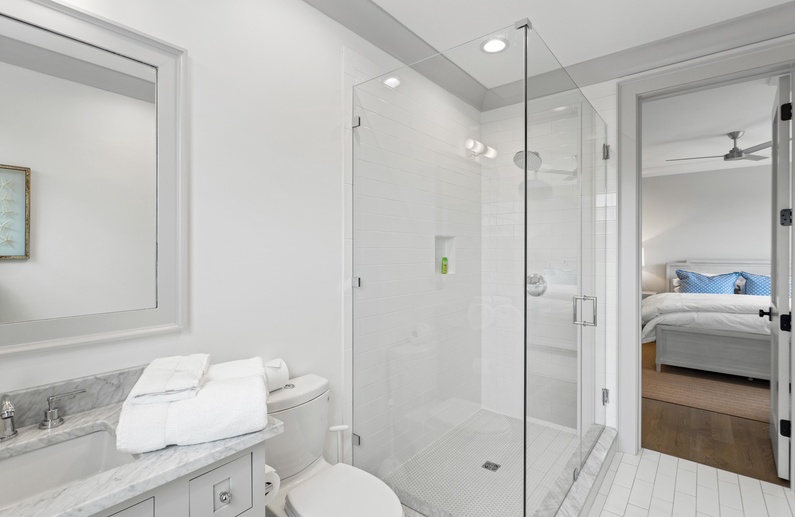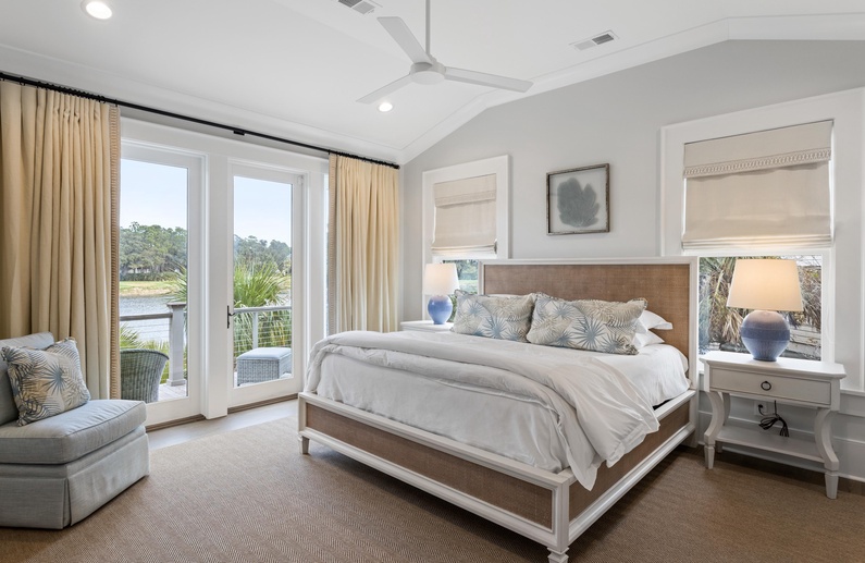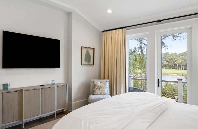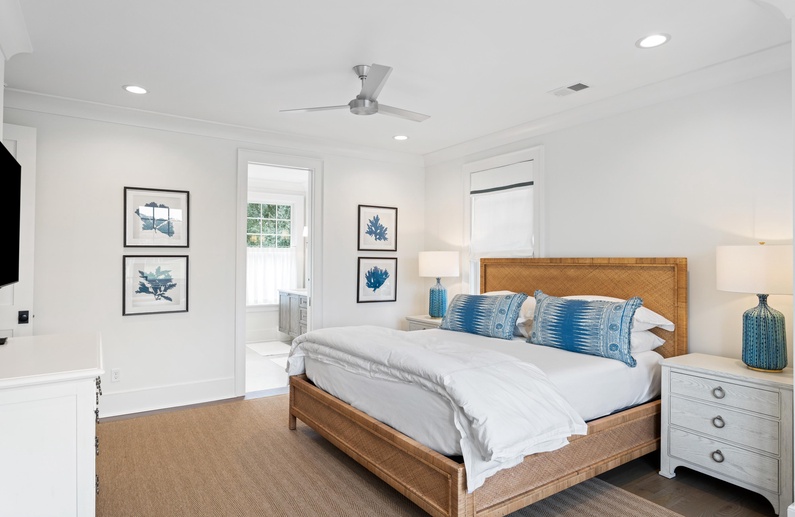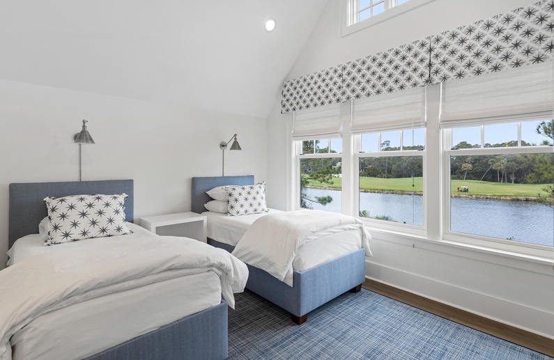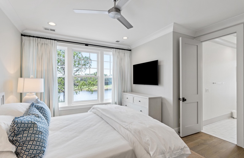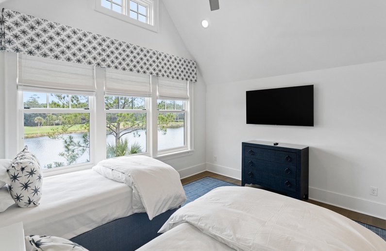 The primary suite on the main floor features a king-sized bed, TV, access to the sundeck, and a luxurious private bathroom with a free-standing tub, spacious walk-in shower, and his-and-hers sinks. Upstairs, you will find three additional bedrooms. The first bedroom offers a king-sized bed, TV, chic coastal décor, and a private bathroom with a walk-in shower. The second upstairs bedroom has a queen-sized bed, TV, and private bathroom with a walk-in shower. The final bedroom has two twin beds, gorgeous water views, a TV, and a private bathroom with a shower/tub combo.