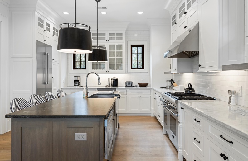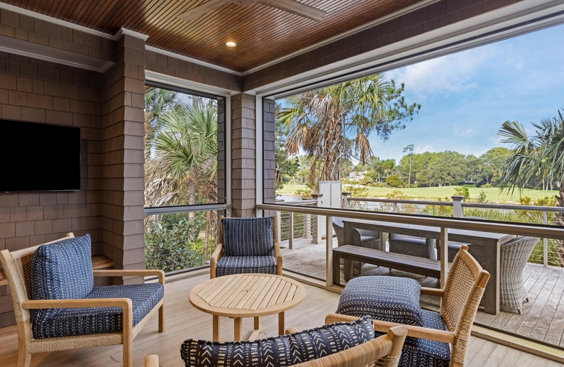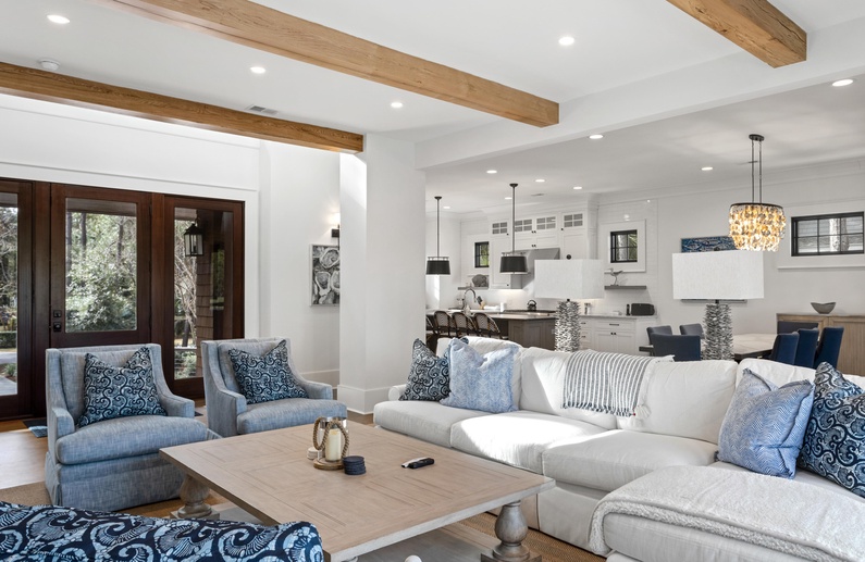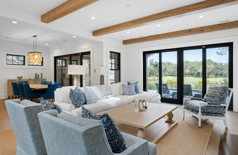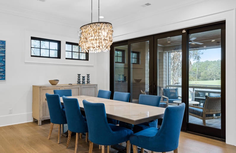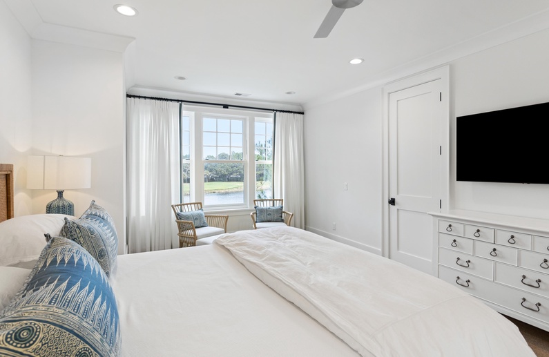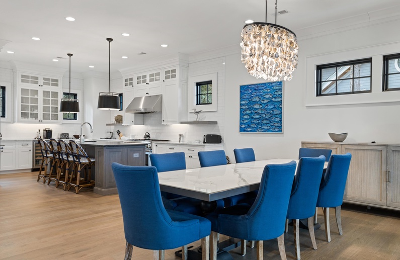 When you enter this home, you will immediately appreciate abundant natural light and professionally selected décor. Like almost every rear-facing room in the home, the living area boasts lovely views of the golf course and Egret Pond. The living room has comfortable seating and spills out into the dining area and kitchen. The dining area features a gorgeous table with seating for eight and access to the screened porch. The gourmet kitchen has a large island with barstool seating for four, professional-grade stainless steel appliances, and everything you will need to prepare your vacation meals.