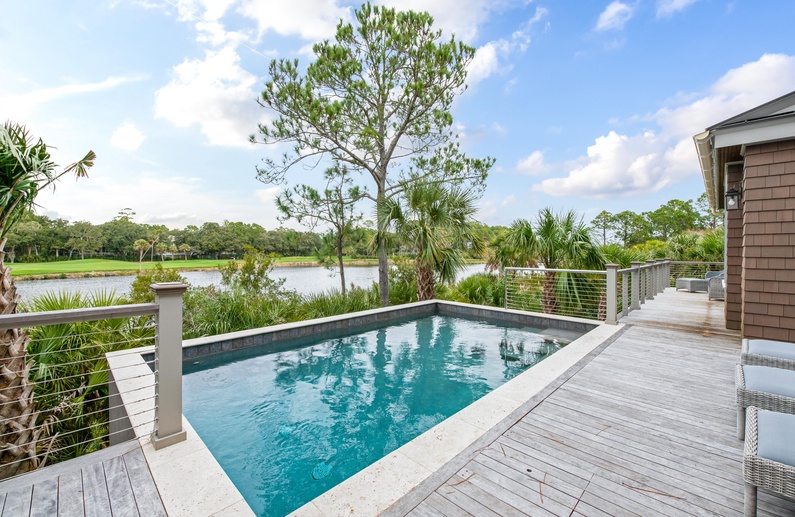 The screened-in porch offers seating for four, a wall-mounted TV, and access to the deck. Enjoy lounging on the 900-square-foot sundeck or take a dip in the waterside pool! The pool is roughly 12x18, 3 to 5 feet deep. The deck area features plenty of seating for lounging and dining.