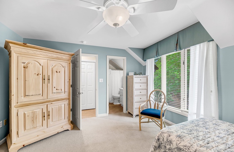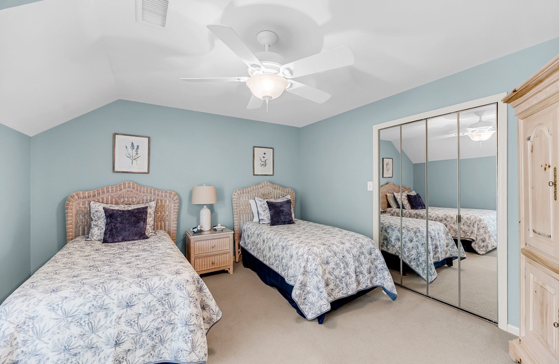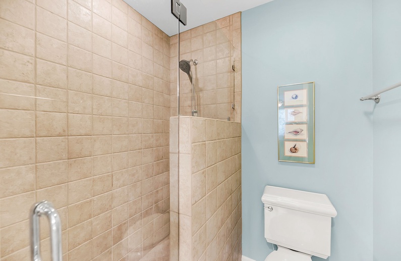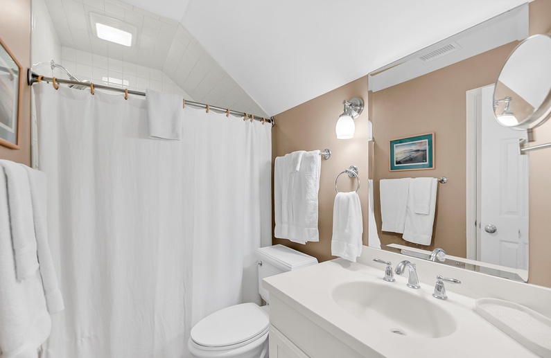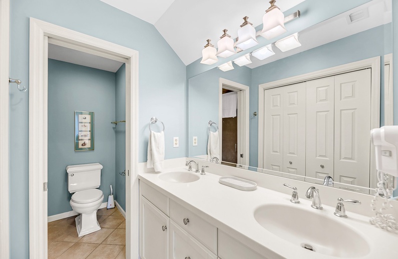 The primary bedroom features a king-size bed, an attached private bathroom with a double sink vanity, and a walk-in shower. The second bedroom is perfect for guests or children, offering two twin beds and an attached bathroom with a tub/shower combo. This bathroom also has access from the hall, making it convenient for visitors.