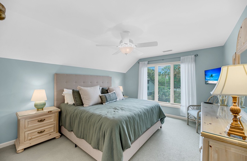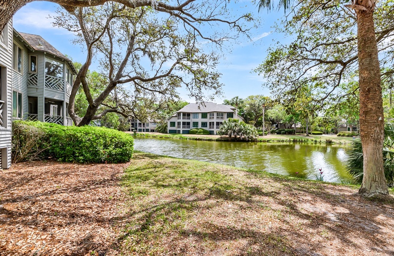 This second story Kiawah Island vacation rental features two bedrooms, a comfortable atmosphere with stunning views over the peaceful lagoon, and is just a 9-minute walk to the beach.