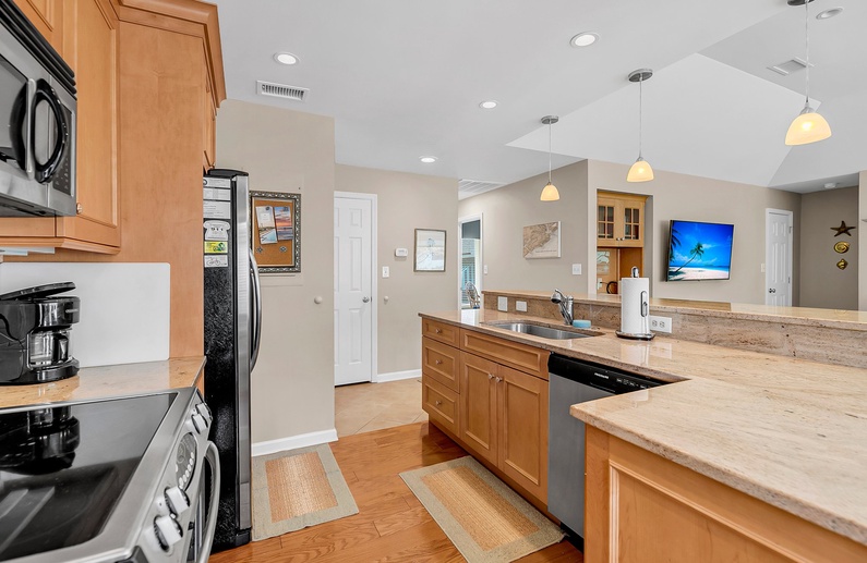 The open living area sits just beyond the kitchen, offering a cozy space to unwind. The sunroom, located off the living room, makes for the perfect spot to enjoy your morning coffee while taking in the calming lagoon views.